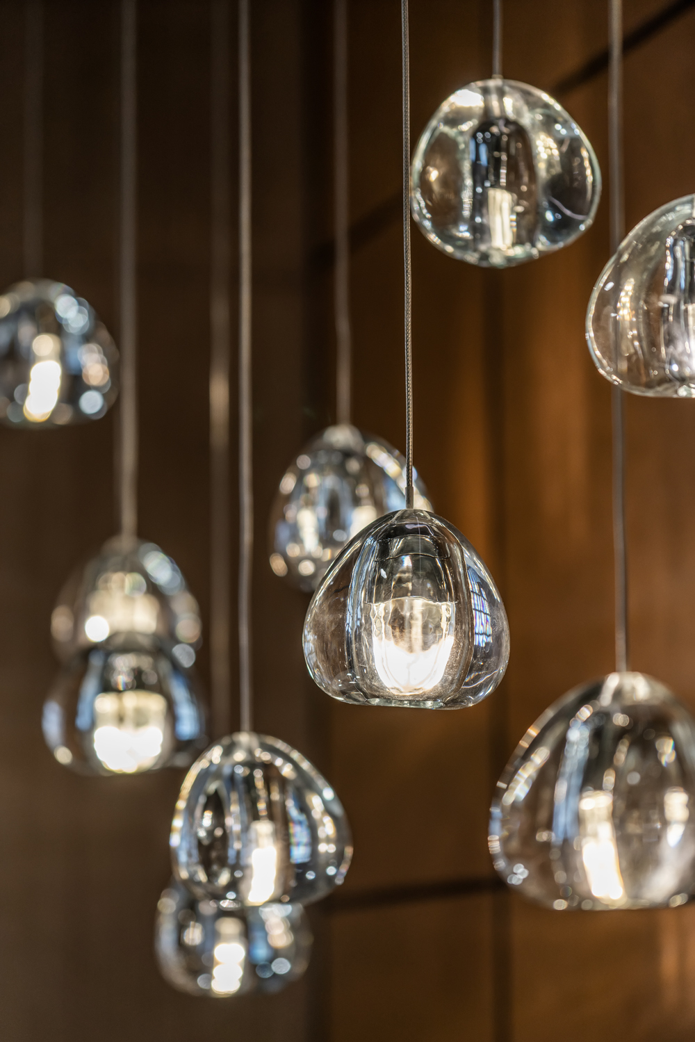 前廳一角,一把隨意的休閑椅構(gòu)設(shè)出安靜而獨立的等候區(qū)。光是一味奇妙而誘惑的催化劑,見證格柵的參差錯落,旖旎于水滴狀通透吊燈,如同午夜巴黎那一杯令人情迷的威士忌,透過光影的變幻,實現(xiàn)精尚定調(diào)。