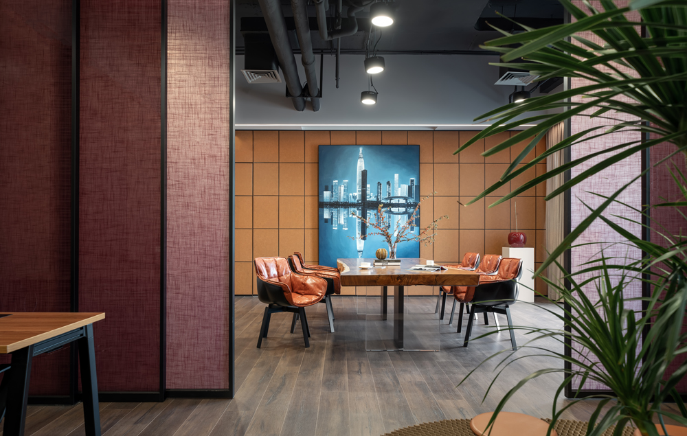 設(shè)計師認為辦公空間的設(shè)計也應(yīng)該是溫暖的、充滿關(guān)愛的,通過空間的靈活切換為客戶創(chuàng)造更多的商業(yè)價值。墻面以磁性黑板漆穿插其間,實現(xiàn)視覺上的層次迭代。薄暮紫夾絲玻璃推拉門實現(xiàn)了會議室與辦公區(qū)的自由切換,開放式空間為來此進行房產(chǎn)咨詢的精英人士提供了線下答疑、培訓學習的平臺,成就雙方合作共贏的發(fā)展期待。