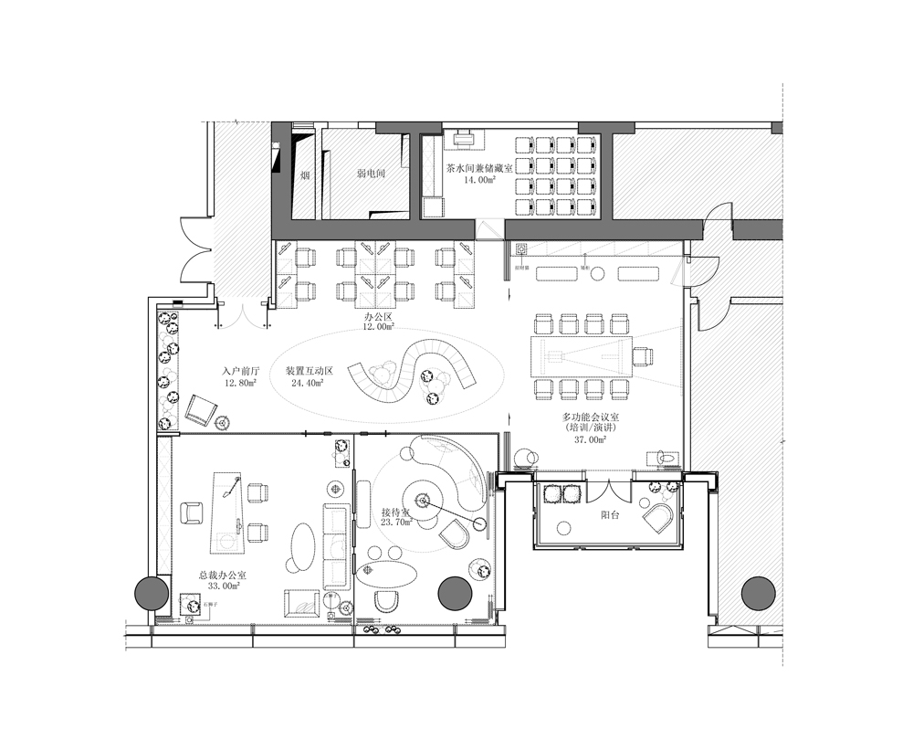 良好的秩序是企業(yè)管理中至關(guān)重要的一環(huán),設(shè)計師將傳統(tǒng)的分區(qū)規(guī)則弱化,通過漏斗狀開放性的空間布局,賦予空間招財納福之意,以包容的姿態(tài)歡迎更多的圈層精英,展現(xiàn)了企業(yè)的人文關(guān)懷與藝術(shù)性。