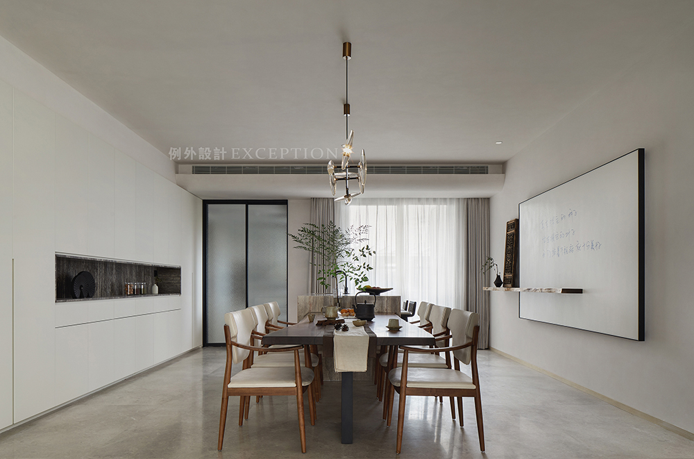 餐廳與西廚島臺連成一體,為家人的就餐時光增添了更多的選擇性。木質多功能長桌既是品嘗人間風味的歡樂場,也是家人休閑桌游的決勝地。