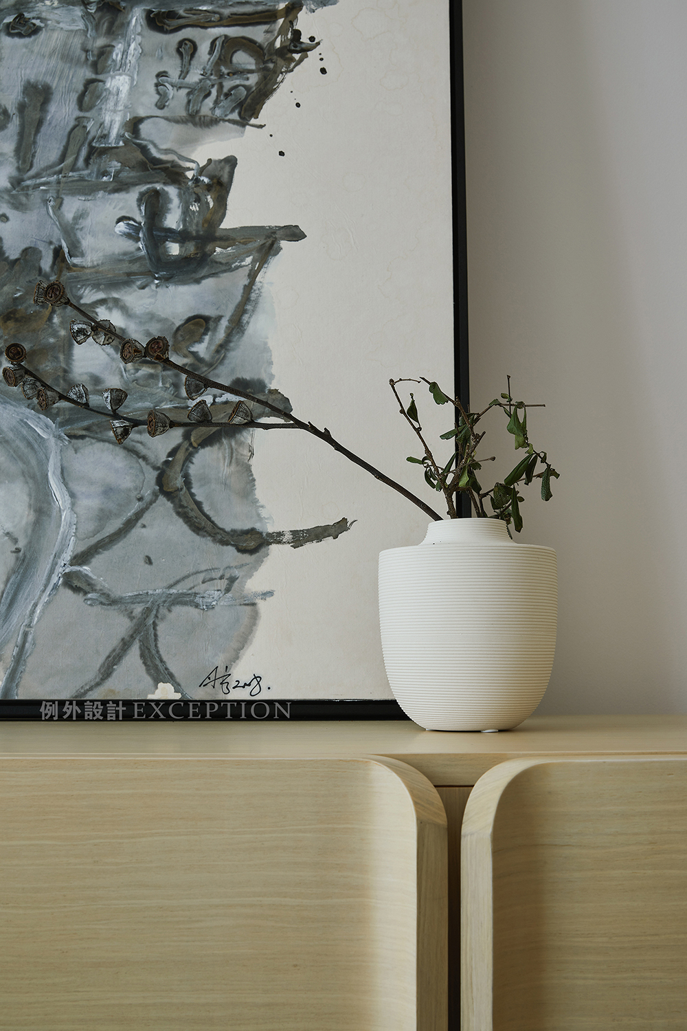 空間是生活情致的延續(xù),也是存放美好回憶的容器。推開家門,友人相贈的畫作,瓷瓶枯枝曼妙,身披長白山風雪而來的木飾,配搭和諧,一縷時光沉淀的古樸況味,細膩綿長,謐靜心寧。