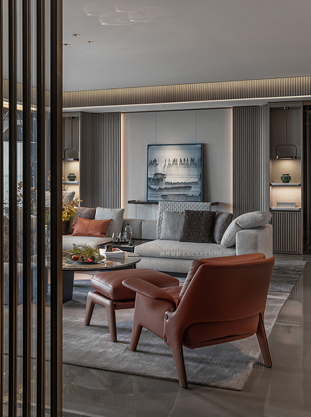 步入空間,沒(méi)有堂而皇之的冗雜堆砌,年輪變換而來(lái)的木格柵,充滿韻律的舒展,是入眼可見(jiàn)的沉穩(wěn)氣度。皮革、木飾、金屬之間的材質(zhì)碰撞,暖棕、雅木、米白的無(wú)聲交匯,設(shè)計(jì)如同一只無(wú)形的手,平衡著空間藝術(shù)與生活的尺度。