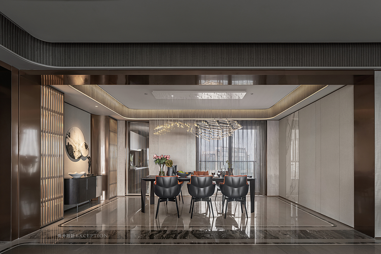 餐廳在延續(xù)整體的朗闊格局后,以不同的形式實(shí)現(xiàn)生活的分區(qū),繁星點(diǎn)點(diǎn)的吊燈是自在暢游的魚(yú),左邊圓月掛件端然靜謐,右側(cè)水墨理石紋理縱橫飄逸,椅面上柔和穩(wěn)重的棕紅,是端然中一絲不羈的時(shí)尚,隨性而不乏精致與家的溫度。