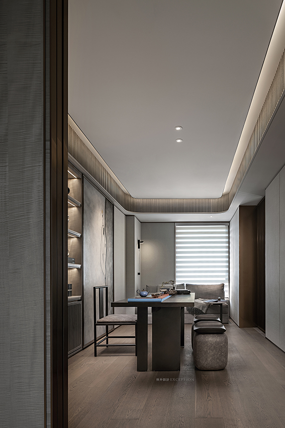 一面井然有序的書(shū)櫥,藏納了空間的詩(shī)意與文思,手繪墻與硬包的結(jié)合,黃銅與實(shí)木鑲嵌,豐富空間的層次感,營(yíng)造清靜閑適的光景。