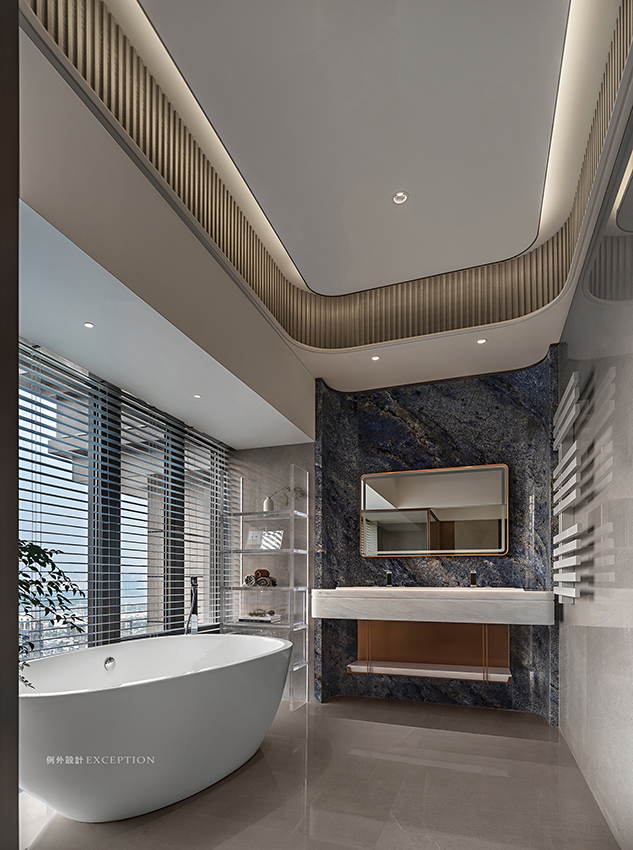 主衛(wèi)以簡(jiǎn)潔清雅為空間基調(diào),亞克力置物架通透實(shí)用,與精品衛(wèi)浴一起彰顯著人性化的設(shè)計(jì)考量。藍(lán)寶石狀大理石塊面作為空間的點(diǎn)睛之筆,似大海的旖旎海浪,天空的無(wú)垠湛藍(lán),百葉窗外一線城景,室內(nèi)水汽氤氳,一首曲調(diào),浪漫而放松,愜意且精巧,種種美好感受都在這里慢慢生發(fā)。