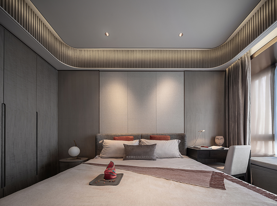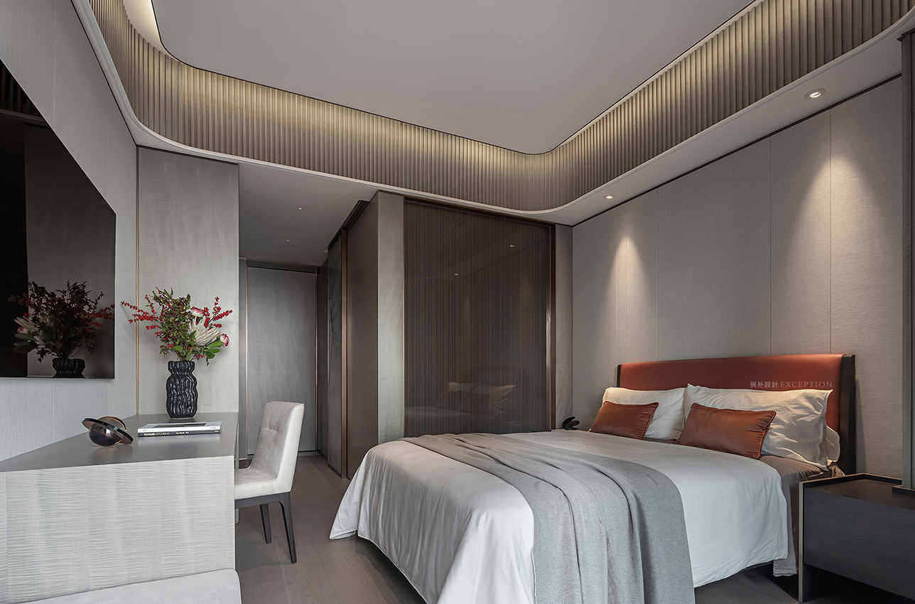 主臥作為套房空間,靜奢而不失生活的藝術(shù)感。方正的格局搭配圓弧形轉(zhuǎn)角沙發(fā),為私域空間增加了豐富的生活場(chǎng)景。不規(guī)則金屬吊燈錯(cuò)落有致,將空間的品質(zhì)感再次提升。