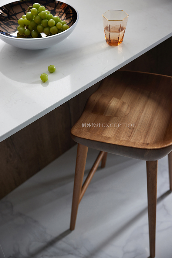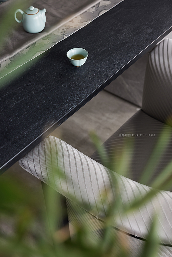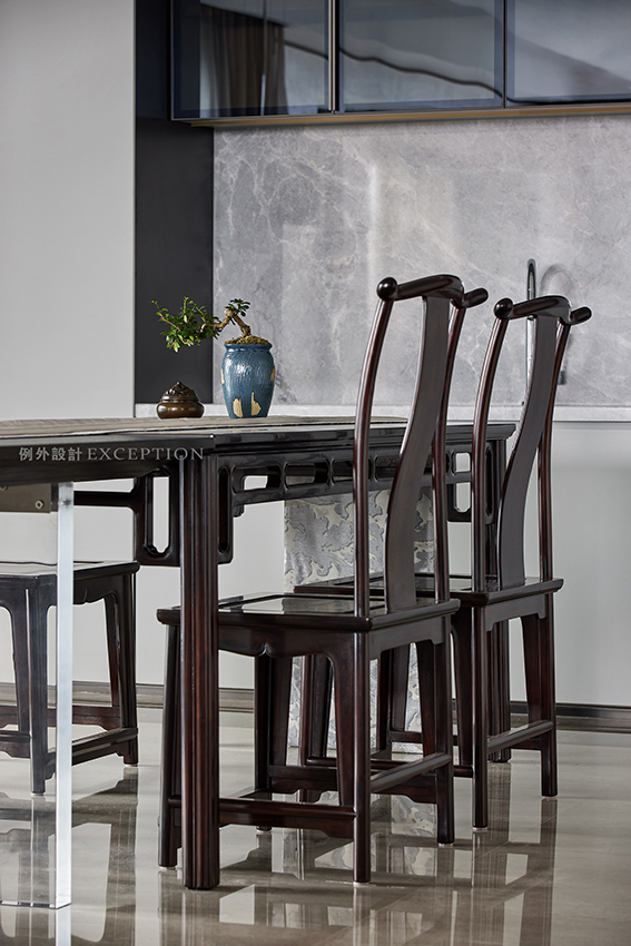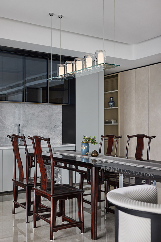 提到文化的傳承,在現(xiàn)代生活語境下,更多的表現(xiàn)為傳統(tǒng)與當(dāng)代邊界的消弭、和解與重組。餐廳的設(shè)計凸顯了屋主對傳統(tǒng)家具的欣賞,定制大理石茶臺與已有的餐桌組合,豐盈了空間的 層次與氣質(zhì),無論餐饗或品茗,都是氣定神閑的從容與自如。
