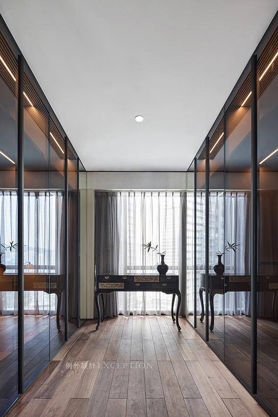 衣帽間是彰顯女主人氣度風(fēng)華的所在,對稱而列的衣櫥足夠容納春夏秋冬的美學(xué)靈感,在專屬的私人空間表達對于生活日常的熱愛與理解。