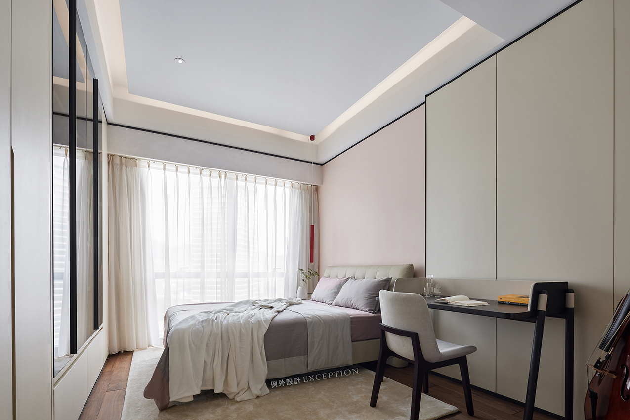 主臥套房以半通透屏風(fēng)開啟歲月靜好的休憩畫面,空間錯落有致。設(shè)計將原有的兩房打通,屏風(fēng)前是男業(yè)主的私人天地,安靜辦公、潑墨揮毫、研究家具歷史,每一天都內(nèi)心豐盈而曠達。