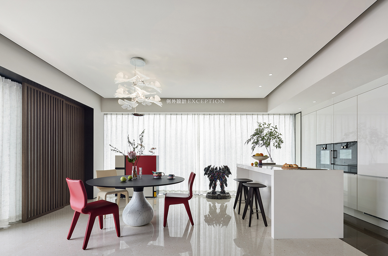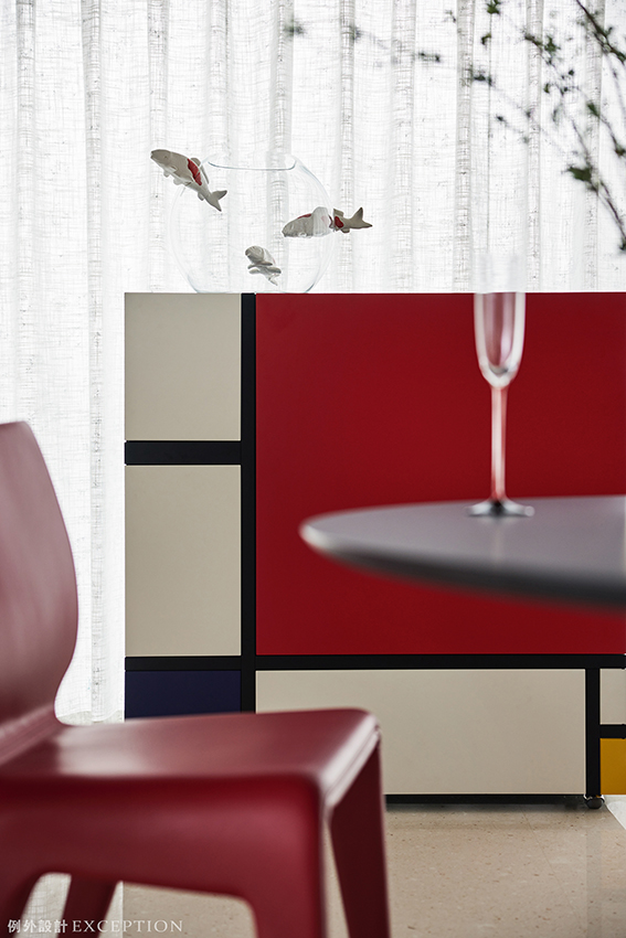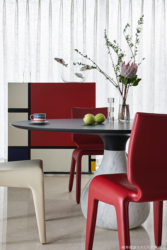 蒙德里安經(jīng)典的紅黃藍(lán)白元素融入餐邊柜的創(chuàng)意中,成為餐廳一隅的經(jīng)典。紅白相配的皮質(zhì)餐椅圍合黑白拼接的水滴形餐桌,豐富了家人三餐四時(shí)的藝術(shù)享受。雅白花朵吊燈更是將這一氛圍烘托得更加濃郁、澄澈。格柵屏風(fēng)朦朧中透露詩意,空間強(qiáng)烈的色彩所調(diào)和的韻律感,成為讓人深情迷戀的所在。