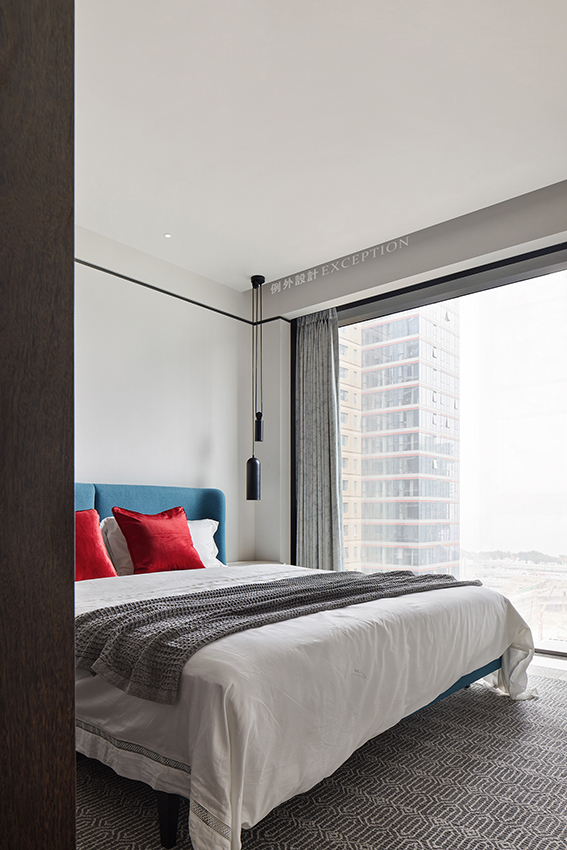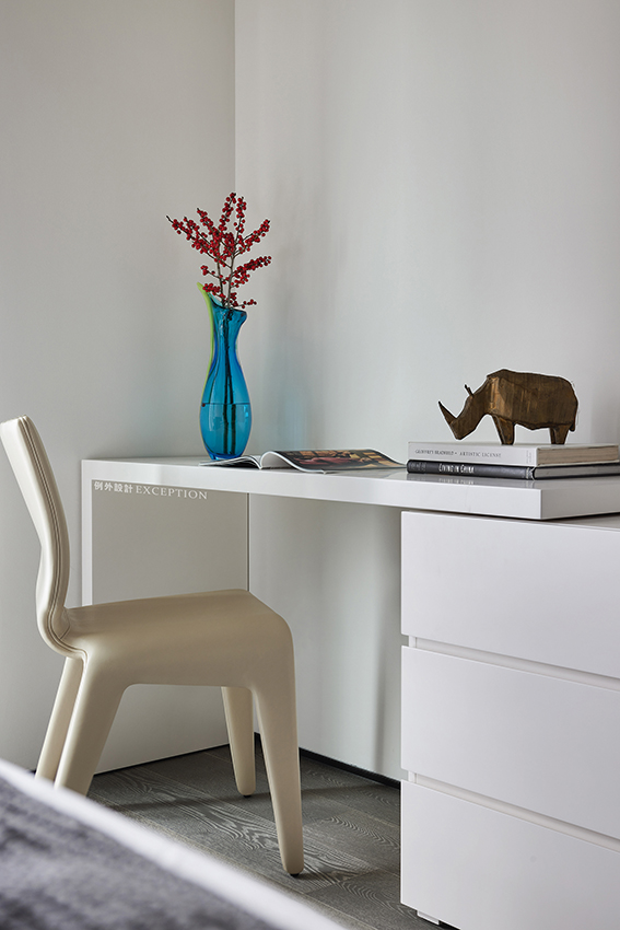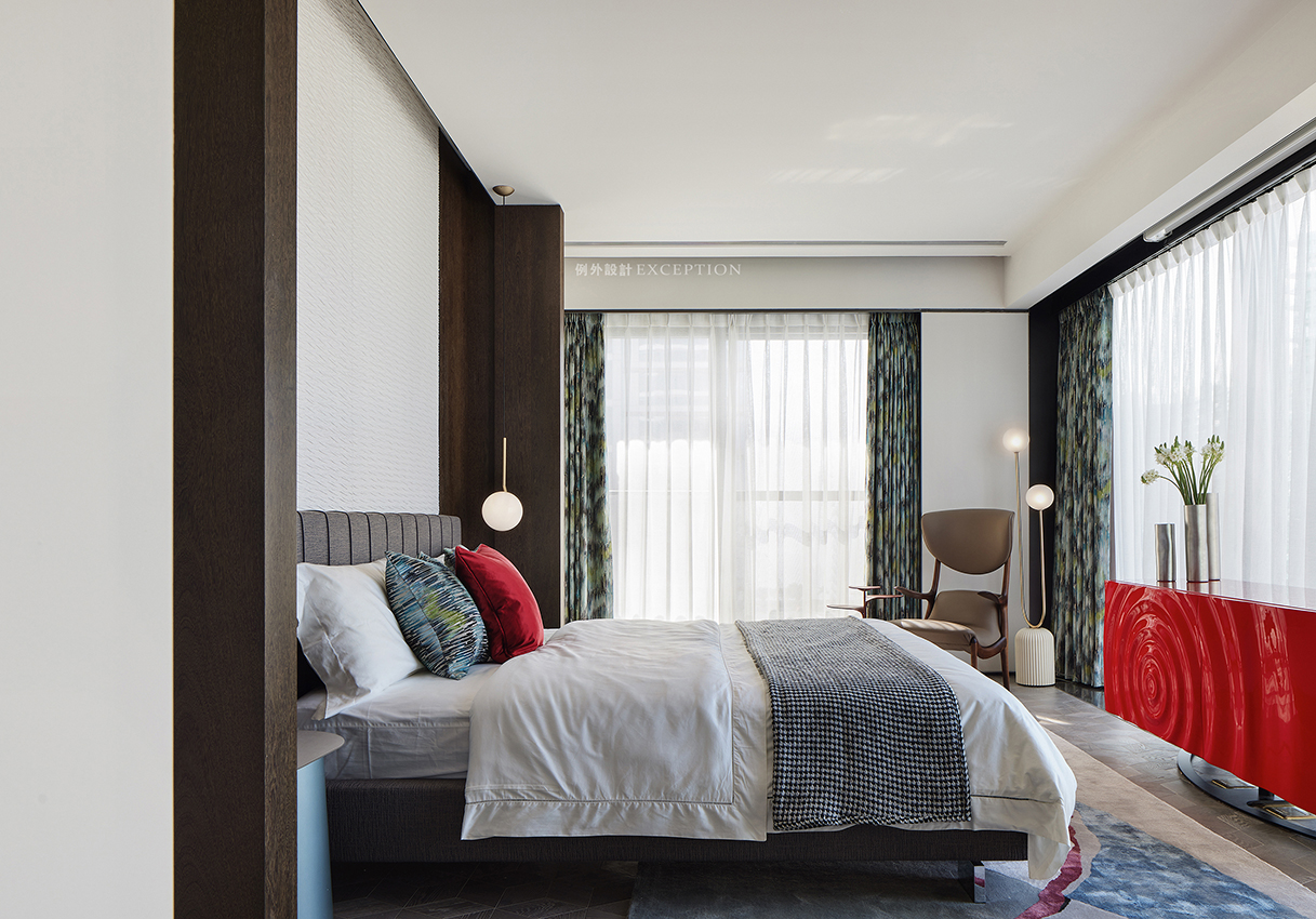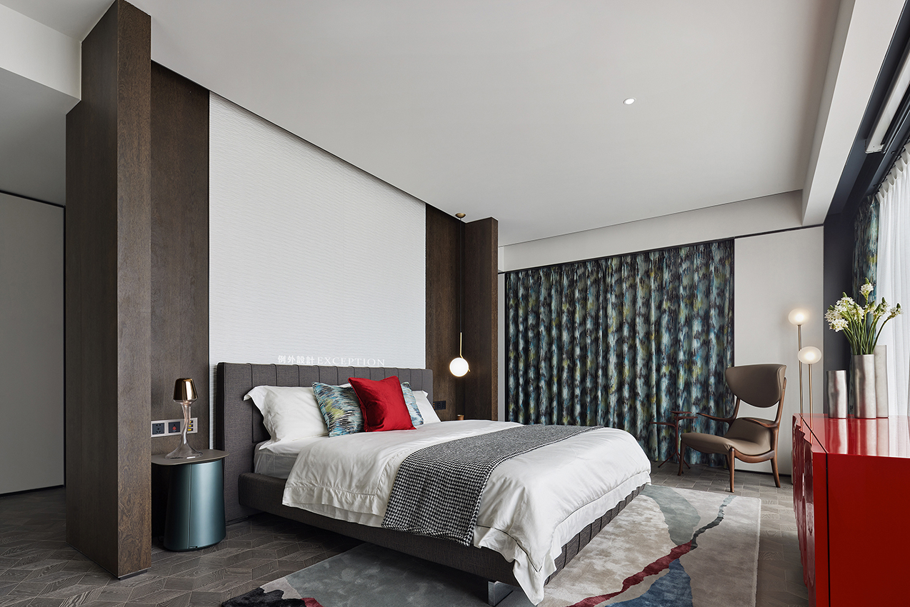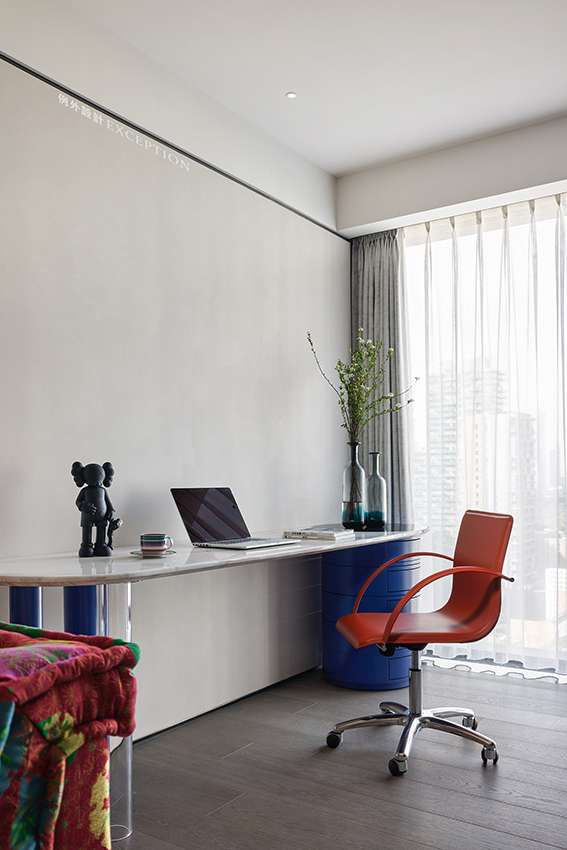 主臥延續(xù)玄關(guān)空間的藝術(shù)線索,床頭墻面白色群魚自在暢游,紅色裝飾柜一圈泛起的漣漪將思緒拉進(jìn)自然的呼吸中,再次強(qiáng)化了如魚得水的靈感設(shè)想。作為一個(gè)私享的休息空間,一部會(huì)心的電影,一次深入的暢談,生活的浪漫情調(diào)都會(huì)生發(fā)于此,余韻悠長(zhǎng)。
