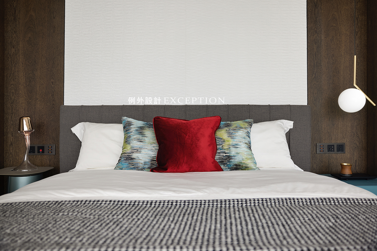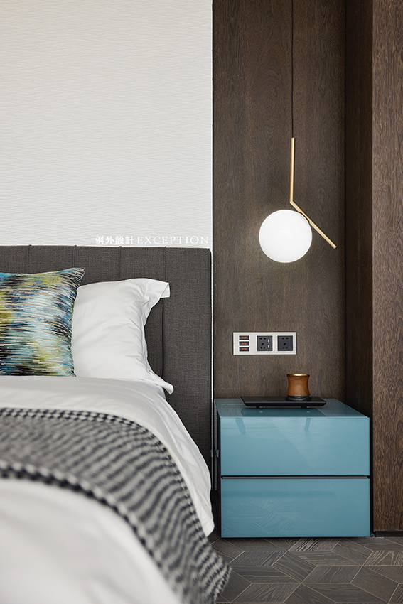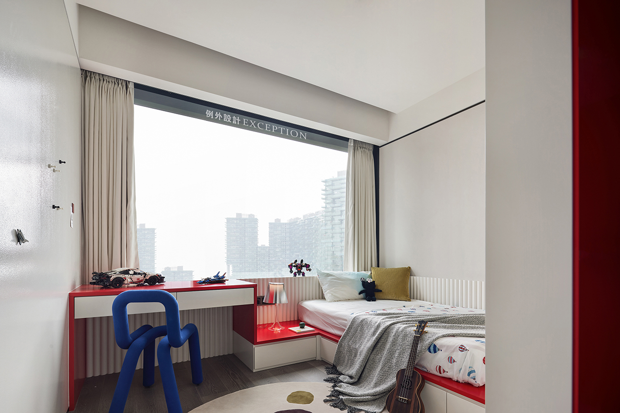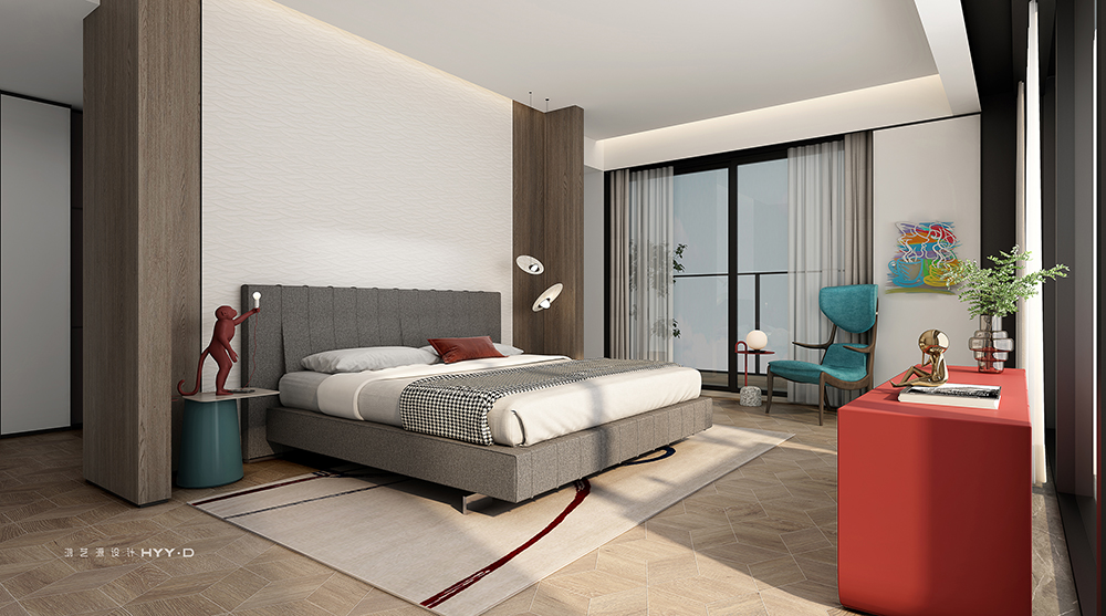 主臥延續(xù)玄關(guān)空間的藝術(shù)線索,床頭墻面白色群魚自在暢游,紅色裝飾柜一圈泛起的漣漪將思緒拉進(jìn)自然的呼吸中,再次強(qiáng)化了如魚得水的靈感設(shè)想。作為一個(gè)私享的休息空間,一部會(huì)心的電影,一次深入的暢談,生活的浪漫情調(diào)都會(huì)生發(fā)于此,余韻悠長(zhǎng)。