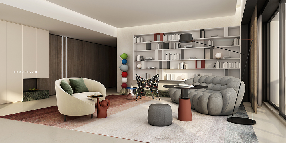 紅棕色漸變地毯鋪就一室的俏皮與優(yōu)雅,整面米色開放式櫥柜,滿足了日常的展示與收納場(chǎng)景。書櫥中的動(dòng)物飾品呼應(yīng)著隨處可見的自然氣質(zhì),不經(jīng)意間一瞥,便能激發(fā)出生活中的幸福靈感。