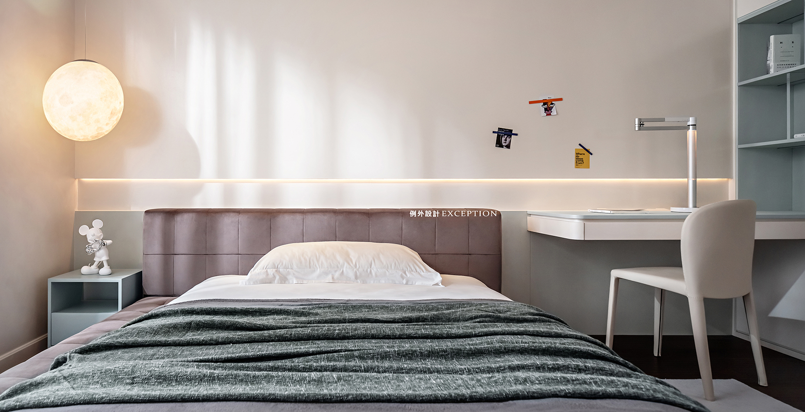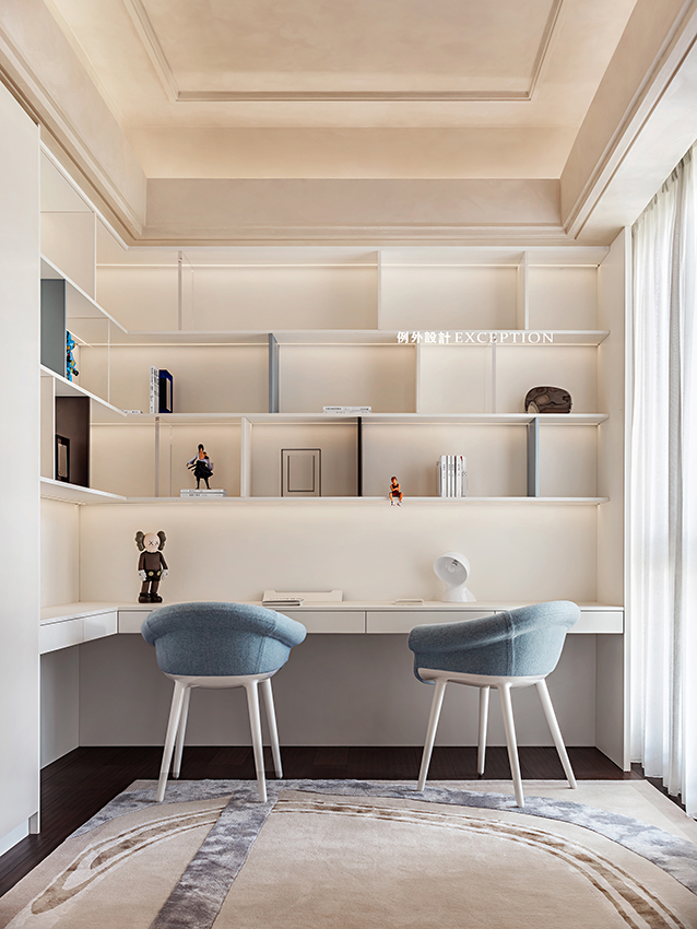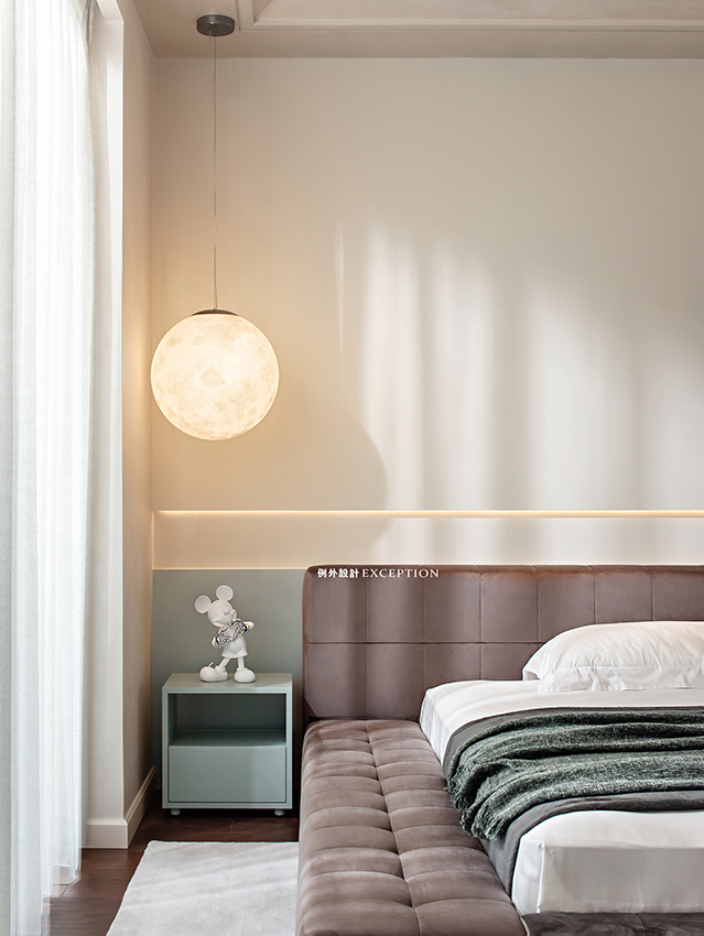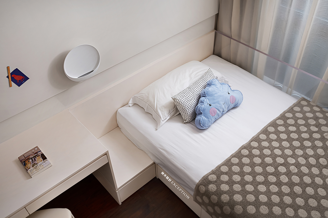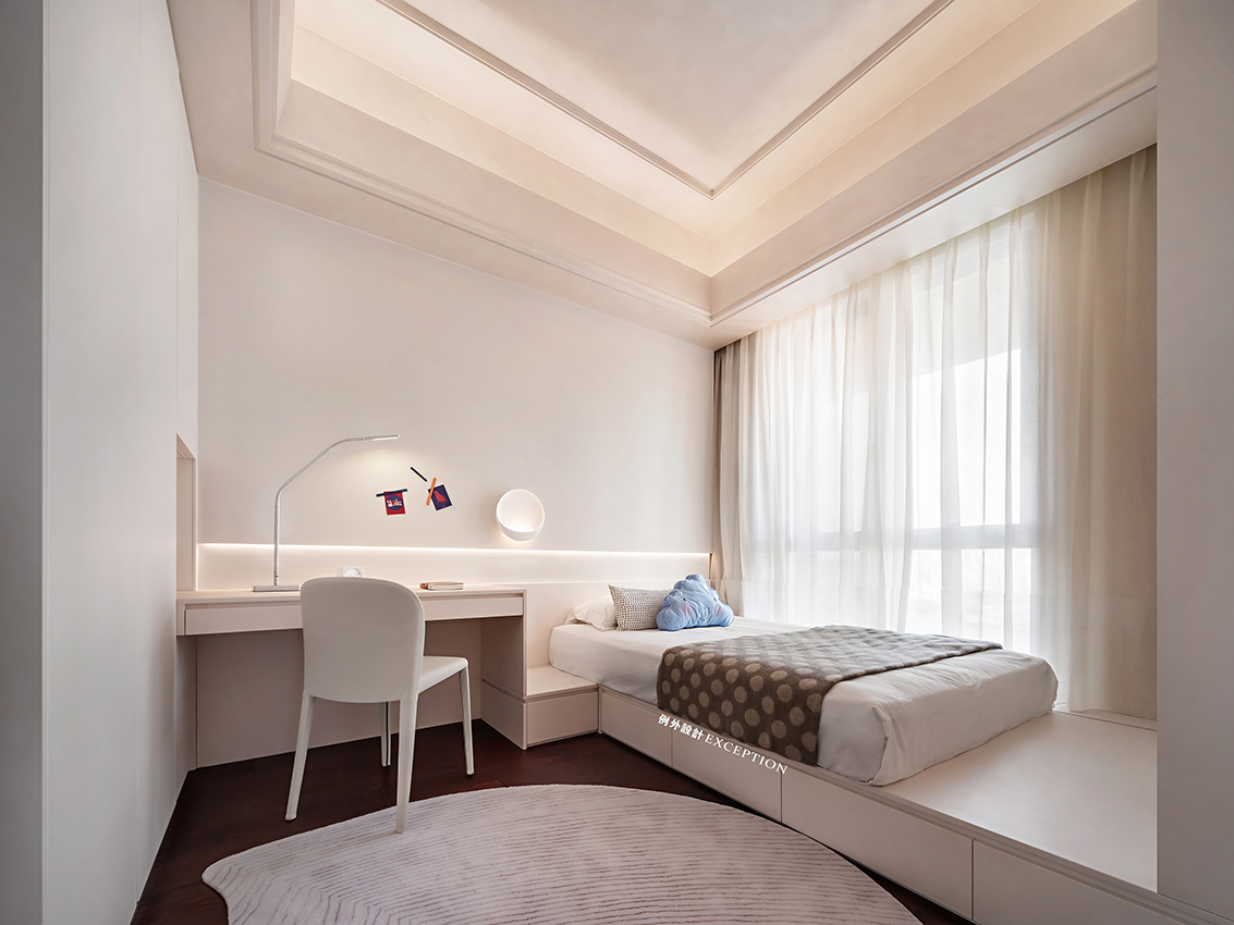 清晨的陽(yáng)光溫煦明媚,是大自然對(duì)人類永不停歇的福澤,讓人滿懷希望去奔赴、熱愛。臥室是孩子成長(zhǎng)的庇護(hù)所,良好的觀景視野是他創(chuàng)想可以抵達(dá)的遠(yuǎn)方,柔和的色彩也為小小的個(gè)人天地預(yù)設(shè)了溫暖純澈的方向。