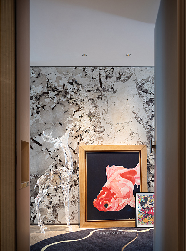 進(jìn)入玄關(guān),眼前斑斕的大理石背景墻紋理行云流水,像春日里碧波蕩漾的湖面,一尾嫣紅靈動的魚游弋出如魚得水的寓意,水晶小鹿仰頭輕嗅陽光的味道,微風(fēng)吹過,滿目溫柔。推開家門的那一刻,看到這些栩栩如生的藝術(shù)作品,一天的煩惱都拋到了腦后。