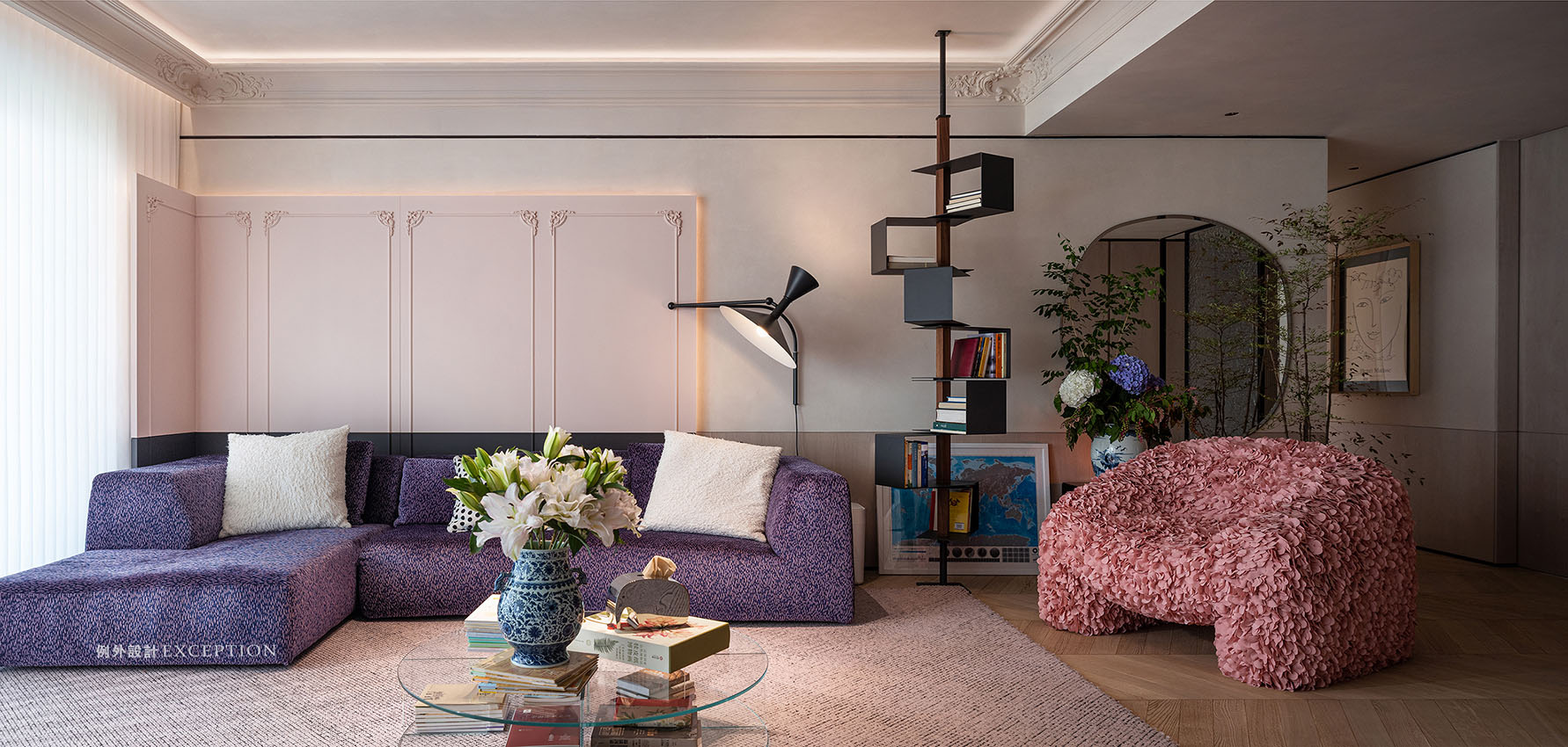 在這個家的設(shè)計過程中,設(shè)計師鄭鴻把控整體格局,關(guān)鍵詞是:簡約有質(zhì)感。客廳的硬裝盡量做到簡潔,天花四周點綴了設(shè)計師徐靜喜歡的雕花,搭配肌理感的藝術(shù)涂料,干凈又有細(xì)節(jié),所以設(shè)計的重點更多是放在靈活的軟裝上?!按笞匀豢偸悄軒Ыo我靈感,紫羅蘭優(yōu)雅高貴,隨處可見的綠葉植物活力盎然,櫻花粉浪漫清新……所以我把瑰麗的自然色彩帶回了家?!毙祆o說道。