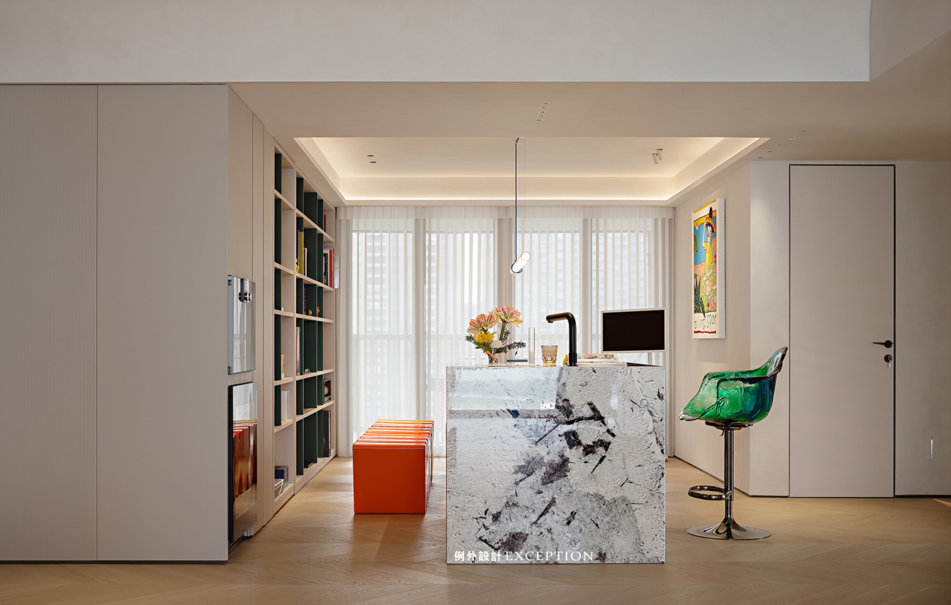 吧臺是屋主待得最多的地方,在這邊專注地辦公或是看看紀錄片,看看書,都是高質(zhì)量的獨處時光。在硬裝上鴻藝源設(shè)計給予了空間無限的留白,讓屋主可以在軟裝上投射自己的品位與喜好。明亮的色彩增加了空間的靈動氣息,edra綠色花瓣椅如同大地的呼吸,在一起一伏間,躍動著生命的力量。