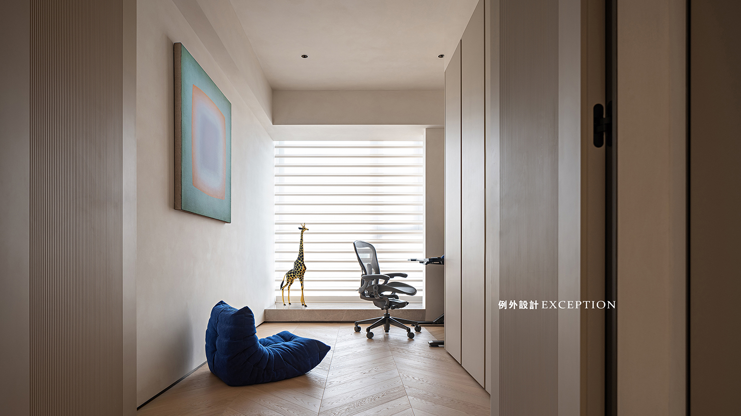 書房是使用頻率較高的空間,畫家陳若冰的作品掛在最顯眼的入口,這是屋主非常欣賞的作品。陳若冰的畫作能夠帶領(lǐng)觀者進入一種療愈的精神狀態(tài),每次從這里經(jīng)過時,她總能感受一種平和、安靜的力量。