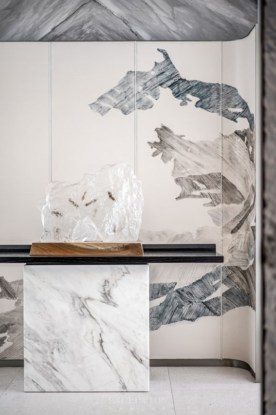 玄關(guān)正中的大理石墻前,是弧形絹絲手繪框畫,其上遒勁蒼枝的古樹描摹,與畫前剔透的水晶山石擺件、兩旁的寫實(shí)山石雕塑輕輕呼應(yīng),在溫煦的燈光下,空間縈繞著靜逸自然的氣韻。