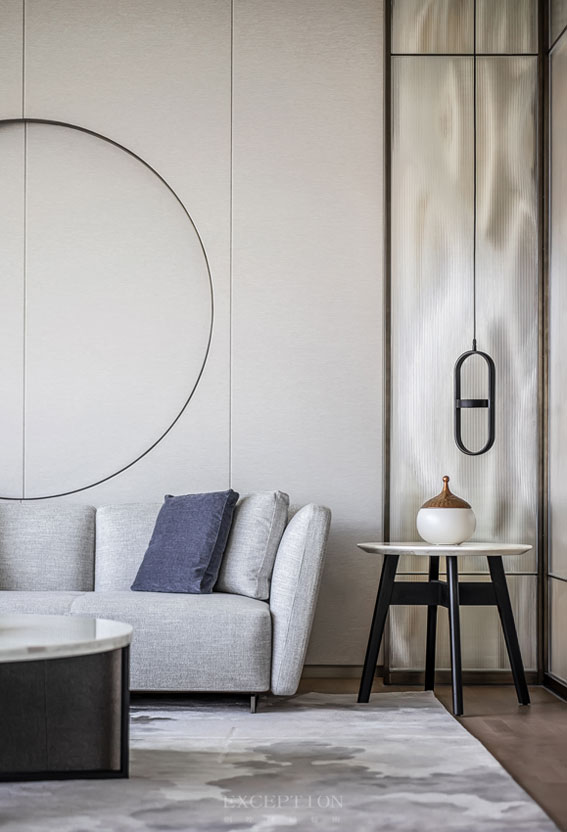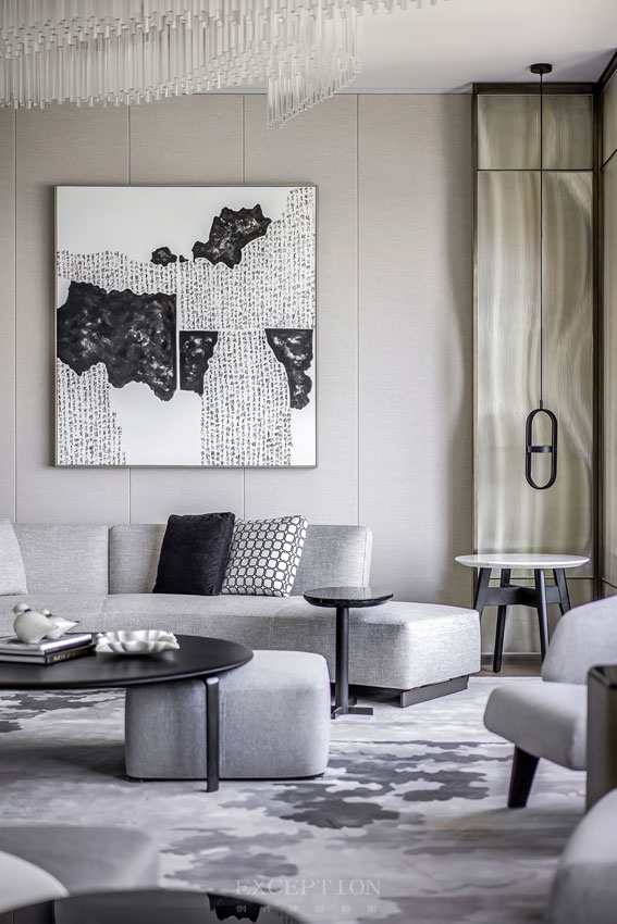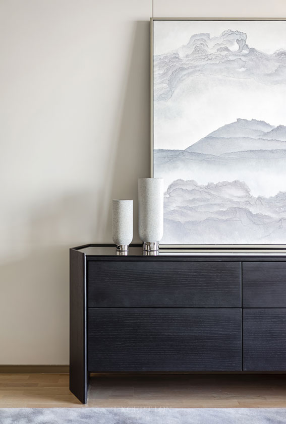 捫布?jí)γ?、定制家具、極簡燈具呈現(xiàn)簡練的線條感;灰白色地毯選取水墨云朵意象,搭配抽象山水掛畫的靜默感、水紋屏風(fēng)、圓月形燈帶、水晶吊燈那流水昱昱的意蘊(yùn),空間呈現(xiàn)自然的樸雅意趣,與屋主的品位不謀而合。