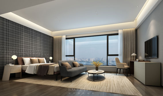 主臥空間低調(diào)柔和的配色與品質(zhì)家具,營造休息空間的簡凈高尚。極簡燈飾的不對(duì)稱搭配、藝術(shù)畫及抱枕上的色彩、地毯上山水倒影的紋樣,打破了空間的單調(diào)感,彰顯室內(nèi)別具一格的審美格調(diào)。