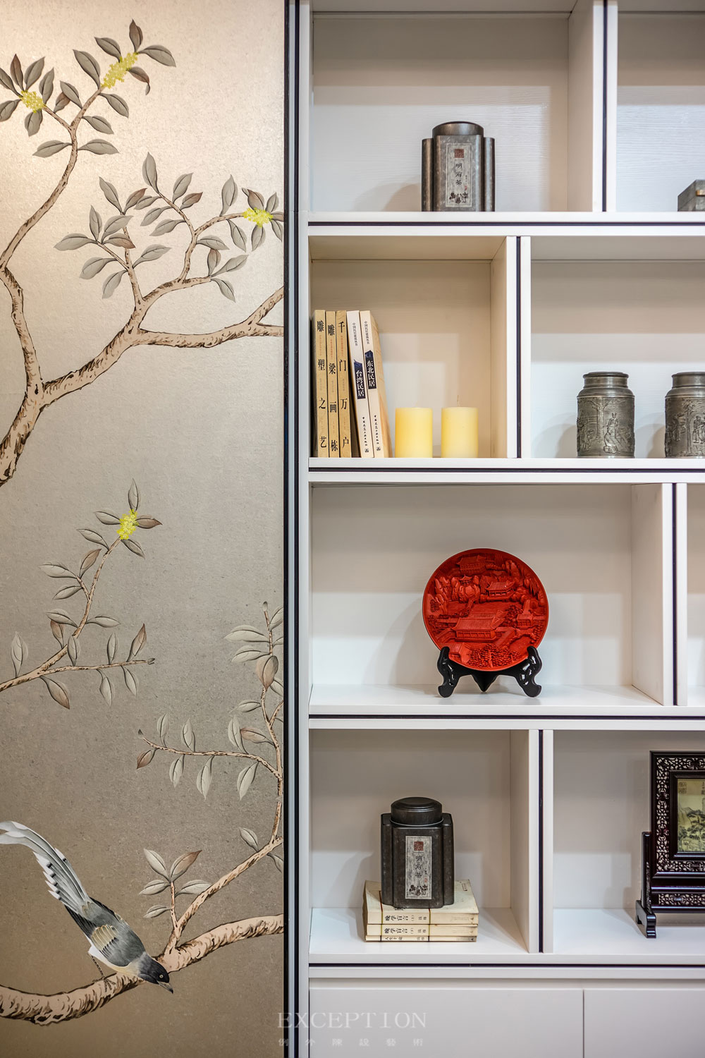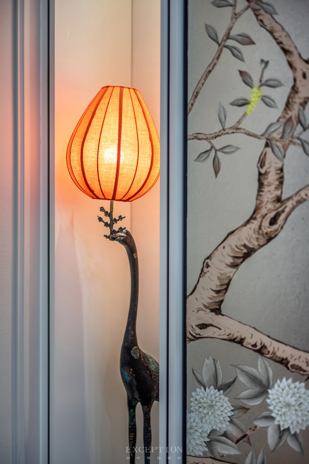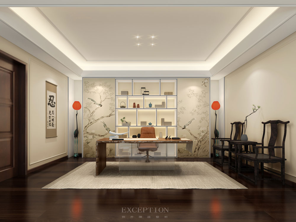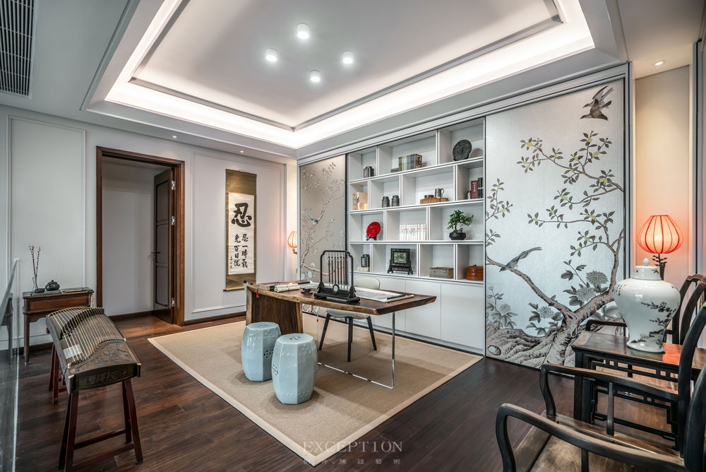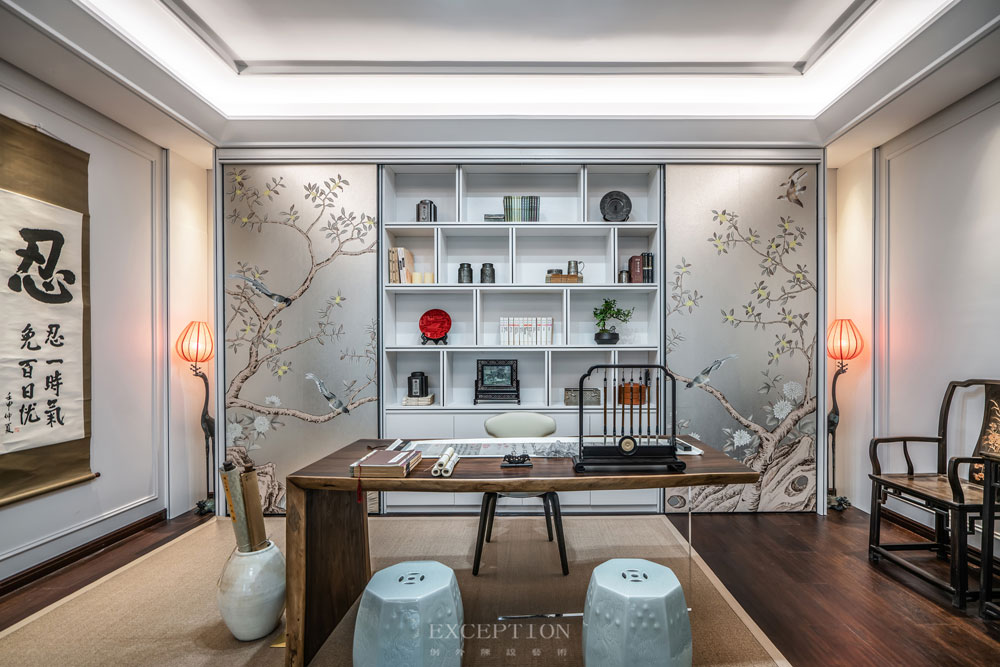 花鳥元素毫無(wú)保留地延續(xù)到書房,一體式立面收藏柜在滿足實(shí)用性需求的同時(shí),賦予空間豐富而又飽滿的層次感。優(yōu)雅的鶴型落地?zé)羯l(fā)出溫熙的橘色光芒,鶴伴鳴琴,花鳥相望。在這里,居者熱情大度地展示著自己的日常喜好。撫琴輕攏慢捻、信手揮毫潑墨、細(xì)嗅墨韻書香,充滿生活氣息的場(chǎng)景如同文藝電影,慢慢講述,細(xì)水流長(zhǎng)。