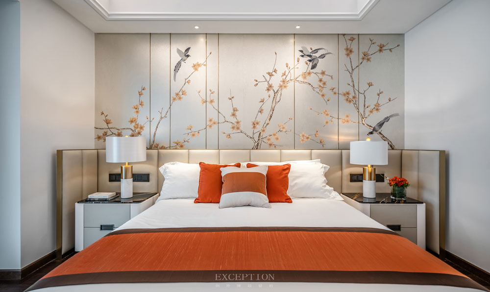猶如一支曲子的高潮部分,花開滿枝頭,雀鳥盼人歸。傳統(tǒng)的花鳥悠閑地在銀箔材質(zhì)的背景墻上縱情盛開、歌唱,與同色系的床品不謀而合,明麗爛漫。每一處細(xì)節(jié)都在展示對(duì)理想生活的美好期待。