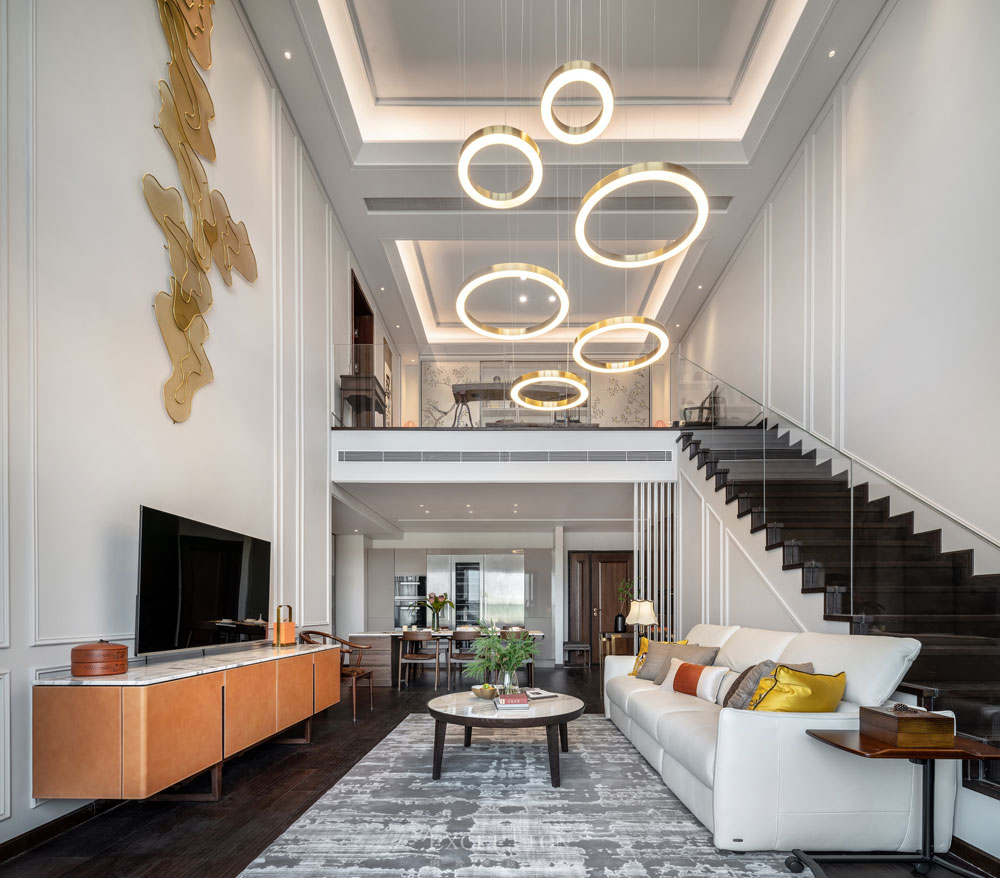 客廳以一種不太對(duì)稱的姿態(tài)進(jìn)入視野,但這并不妨礙設(shè)計(jì)師的設(shè)計(jì)與構(gòu)思,挑高的層空給予設(shè)計(jì)更寬容的尺度。在東方美學(xué)不斷被議起的今天,墻面上升騰而起的金色祥云,古樸圓潤(rùn)的圈椅,喜慶熱烈的橙色系軟飾,都在傳遞開放融合的氣質(zhì),與現(xiàn)代極簡(jiǎn)的線型吊燈共同譜寫空間的大氣靜遠(yuǎn)。