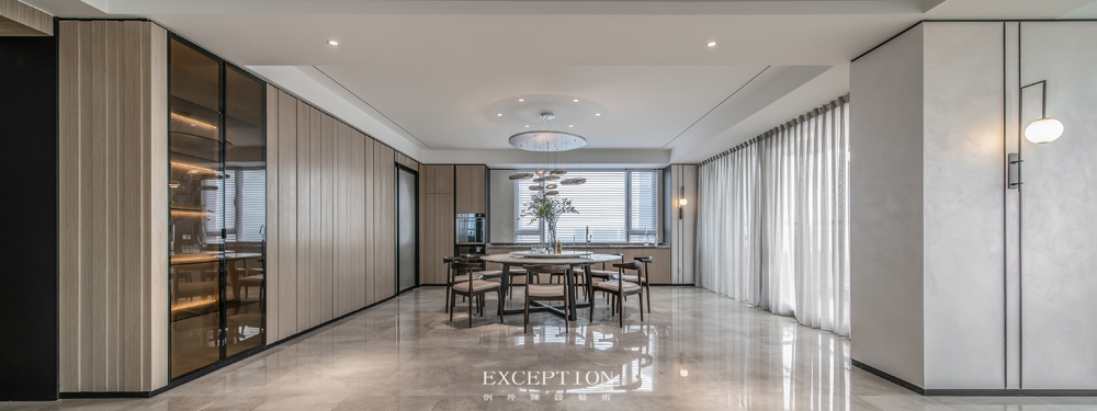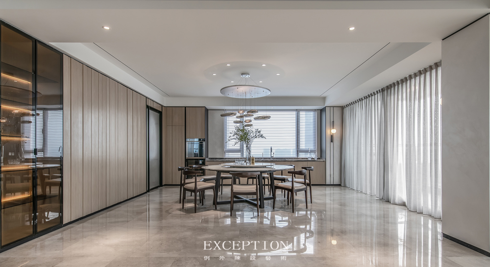 餐廳的燈飾頗有意境,像串聯(lián)一汪汪露珠一樣晶瑩透亮。可容納十人的圓桌構(gòu)筑起中式餐食禮儀,朝迎曦光,暮會煙霞,四時三餐,家人們可以在這里盡情享受料理與就餐的親昵時光。