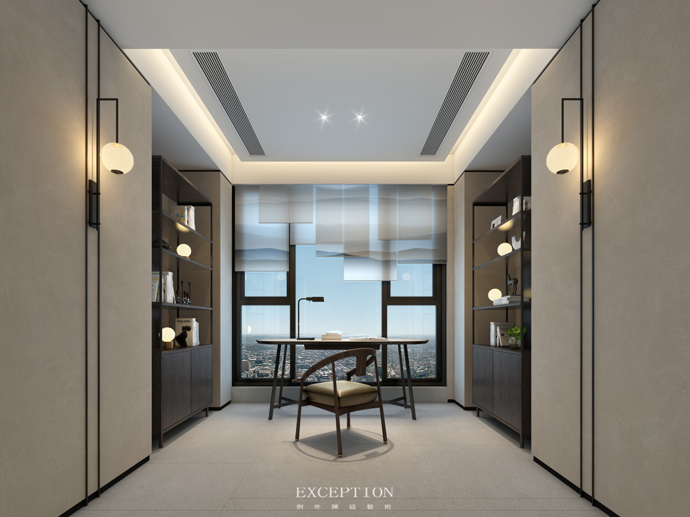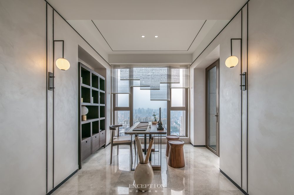 錯落層疊的山水掛簾,與窗外繁華城景對比糅合,仿佛寫意出海市蜃樓的朦朧之美。簡約的中式博古架與盈盈燈飾散發(fā)著簡美古樸的味道,清風(fēng)入堂作伴,斜陽輝光漫灑,設(shè)計將書寫閱讀的場景搭建出婉約閑逸的意境美。