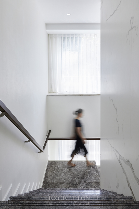 位于負(fù)一層空間的是業(yè)主的私人藝術(shù)廊與藏品展覽室。簡凈的空間視像,一面素樸,一面超驗,呈現(xiàn)出藝術(shù)復(fù)雜而多元的樣子。錯落而不規(guī)則的墻面設(shè)計別出心裁,設(shè)計師特地運(yùn)用差異化燈光,對不同材質(zhì)、不同主題的藝術(shù)品進(jìn)行意境與氛圍的營造,或凝練,或輕盈,流露出藏品獨特且不凡的藝術(shù)氣質(zhì)。