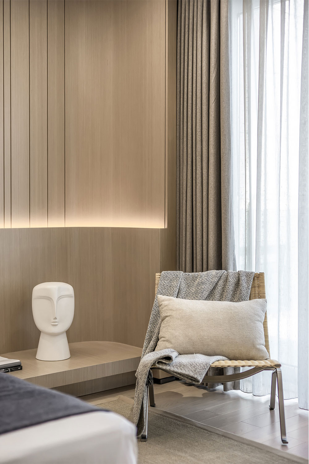 主臥延續(xù)客廳木飾面所營(yíng)造的圍合性,溫暖如冬日的陽(yáng)光。一體化床箱給予睡眠更多的安心感,棉質(zhì)鋪就的灰色床品使人仿佛沉浸在白棉簇?fù)淼膽驯е?,不覺睡意漸濃。點(diǎn)點(diǎn)燈輝如星河萬(wàn)千,時(shí)間被靜止,舒服又愜意。