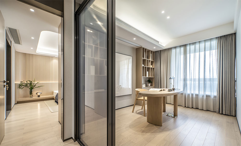 書房的掛畫是水波紋的剪紙畫,如同泉水叮咚流淌,光影、虛實(shí),有著大自然的輕靈、曼麗和灑脫。書桌模擬了水滴的形態(tài),流露出一種無(wú)聲而流動(dòng)的美。在這里可以安靜地看書、寫字,周邊似有水流圍繞潤(rùn)物無(wú)聲,鋪敘儒雅的魅力,一切都顯得純粹、詩(shī)意。