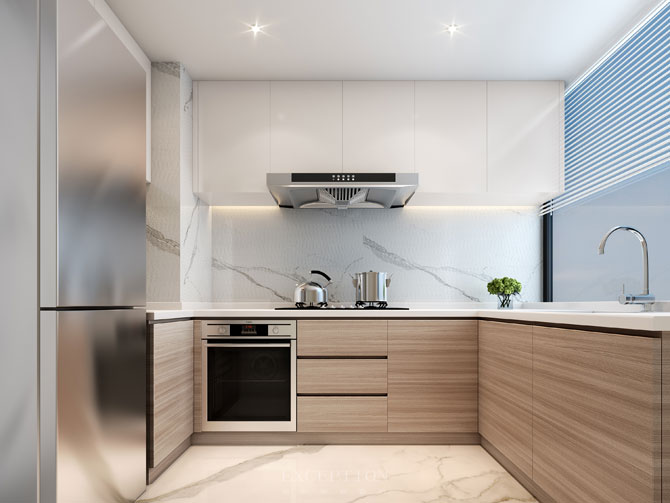 廚房主要著力點(diǎn)在色彩的選擇上,運(yùn)用純潔明亮的白色,從視覺(jué)上營(yíng)造通透的空間感。