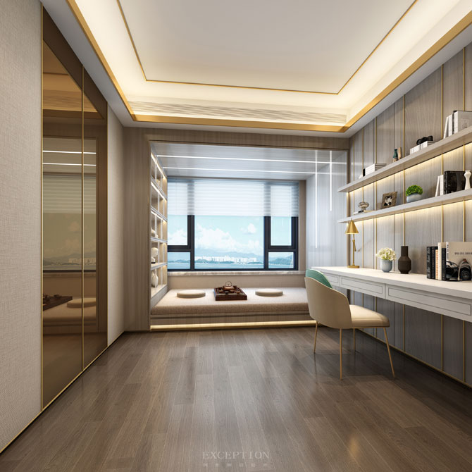 多功能房延續(xù)了線型的設(shè)計(jì),窗前線型透光片呼應(yīng)了墻面的木飾面,與對(duì)面簡(jiǎn)潔平整的柜子形成鮮明的對(duì)比。