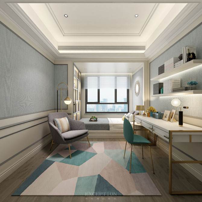 多功能房通過轉(zhuǎn)角造型的設(shè)計(jì)創(chuàng)造出一個安靜的閱讀角,幾何拼接的地毯增加了空間的靈動性,金屬邊框元素的融入,不喧嘩,卻成就了空間的品位。