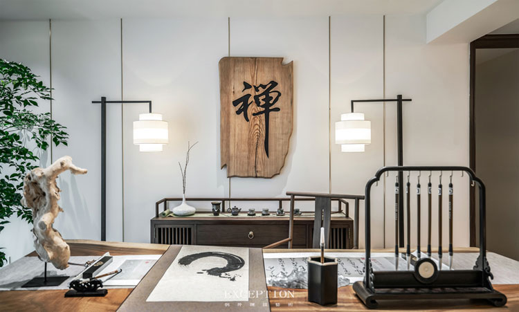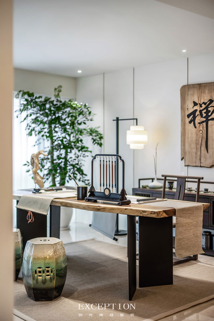 除了精心打造出習字、品茶的閑適意境、空間沒有多余的修飾,纖秀線條框畫的白墻,空濛煙雨霽月藍的鼓凳,木飾掛件年輪,圈出禪意的心境與變遷,無形之中將東方的氣韻植入空間中,所有的設計與陳設都是設計師在對居者生活方式及喜好的審度后進行的選擇,既不失美感,又兼具人文氣息。