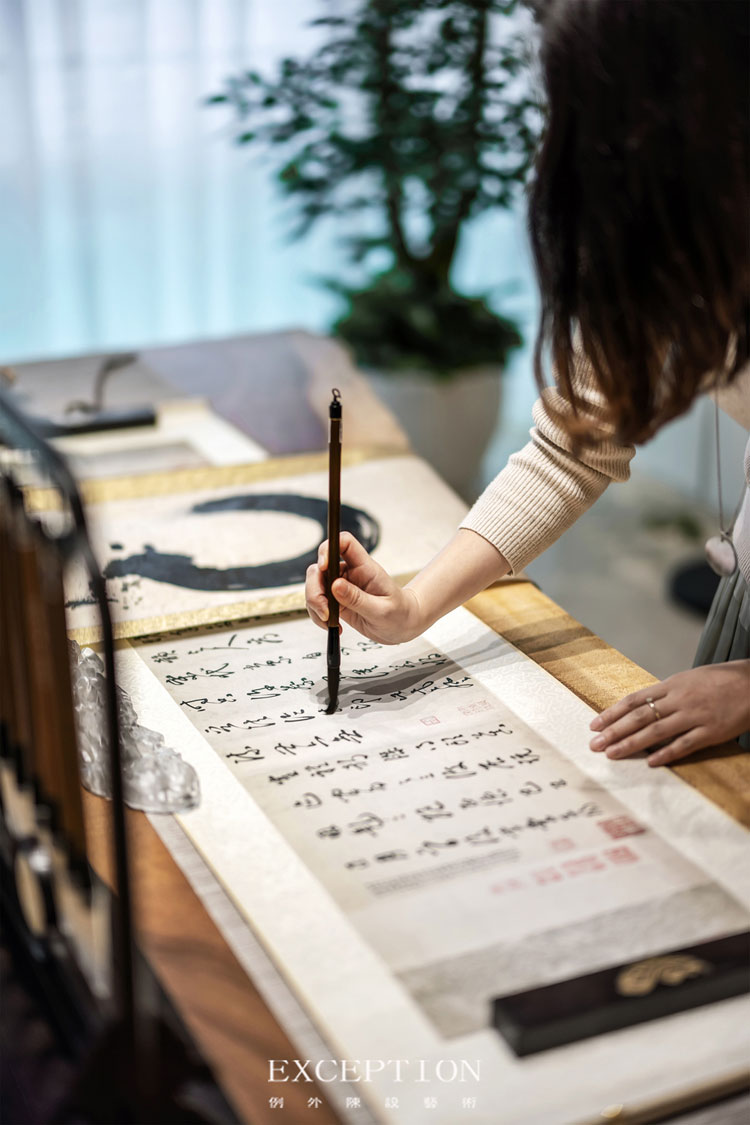 剛剛下過雨的天空泛著微光,灰青色中夾雜著透亮的白。小憩過后,輕啟紗簾,細嗅,有松風的清冽氣,循著墨香,上次臨摹到一半的書帖猶在,提筆,精心勾勒博大精深的文化精粹。腕底翩然驚風,紙箋墨運乾坤,松風送來禪意,筆間暈染情致。