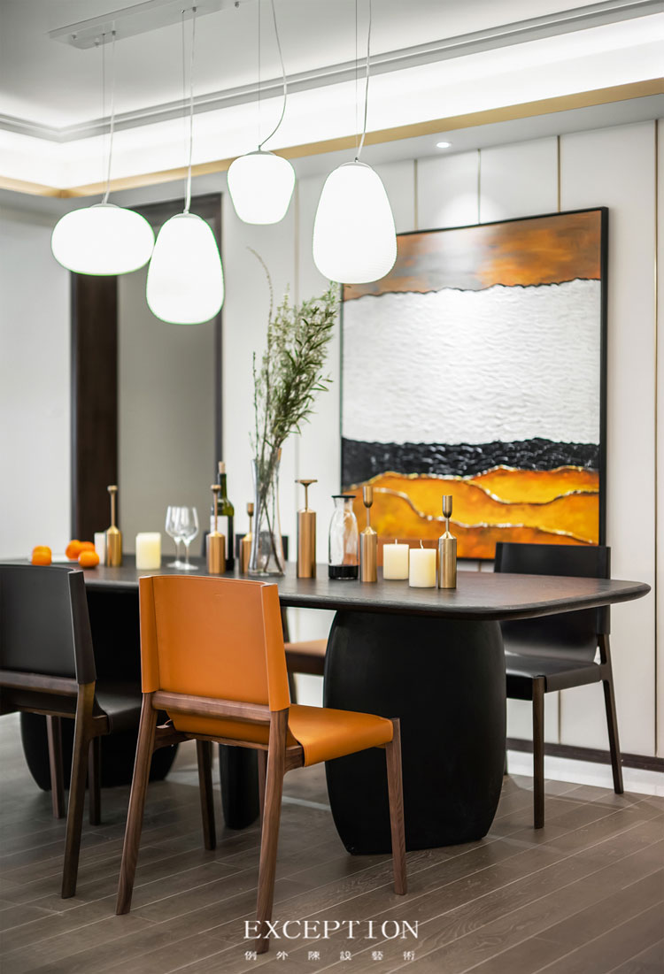 在餐廳,設計師透過金芒的色調來勾起人食而知味的味覺想象。高低錯落的燈飾有露珠的夢幻,其外形也不乏米粒帶給人的踏實感。簡約木質餐椅通過黑與棕黃的有序排位,在躍動的色彩組合里開啟家人間溫馨的餐享時光。