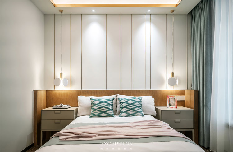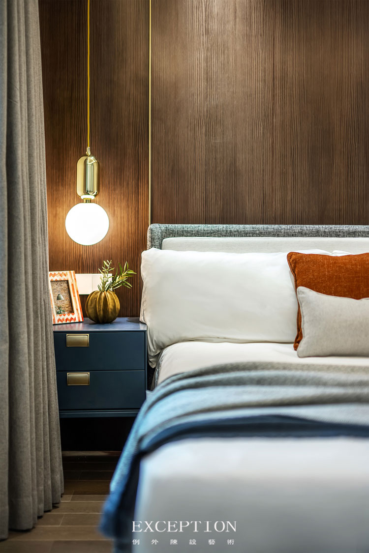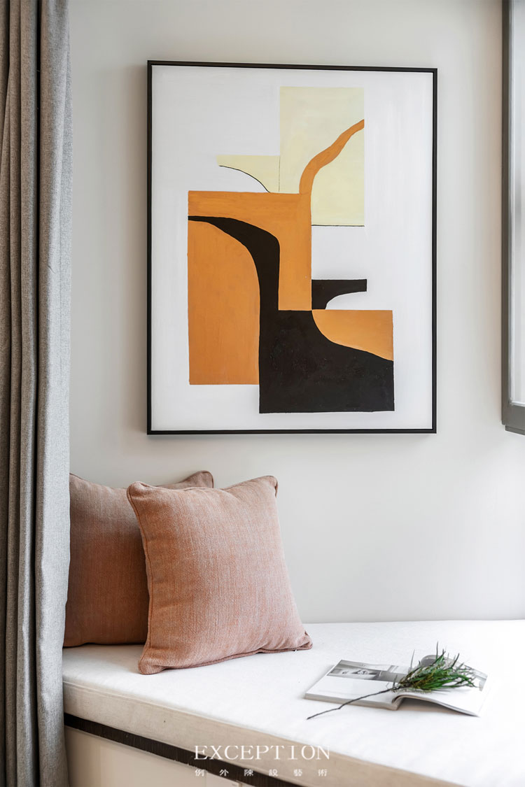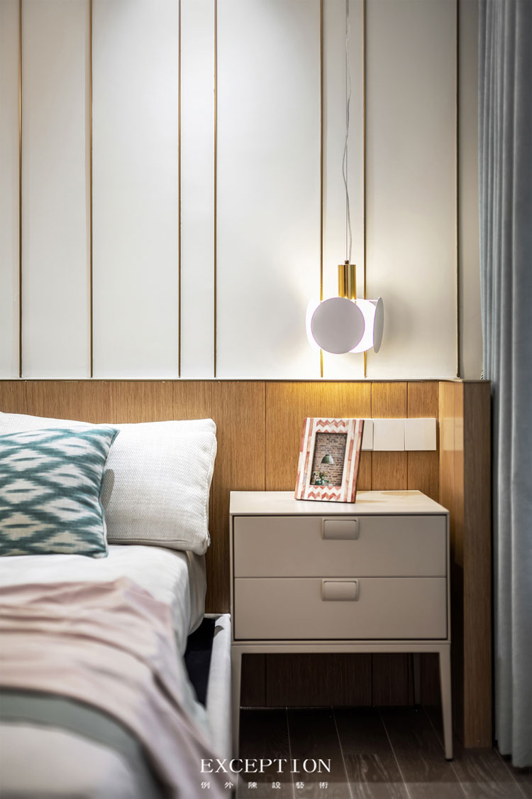 主臥繼續(xù)回歸靜謐淡雅的路線,閑時可引清風作伴,以書為媒去探求未知的精神境界。窗邊床頭背景,延續(xù)客廳的紋飾,重疊往復,似一首經典曲調的副歌部分,在一遍又一遍之中找尋到空間的韻律感。床頭柜拒絕了對稱的展示,而是定制大小不一的柜體讓空間得到合理的利用,線條利落而干凈,牽引出最個性的空間氛圍。