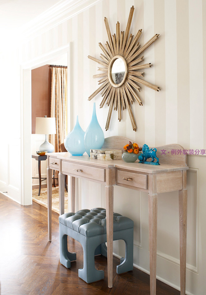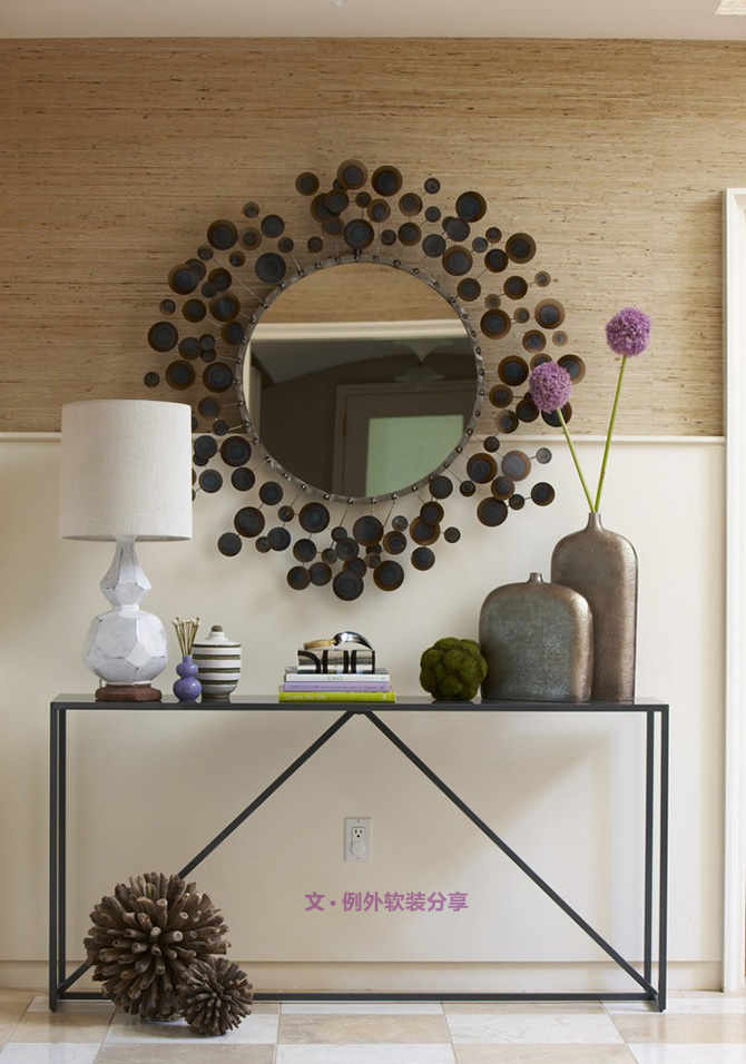 臨出門整理妝容的習(xí)慣讓玄關(guān)裝飾鏡成為必須,而且狹長走廊式樣的玄關(guān),原本在擺放了玄關(guān)柜之類的家具后就更顯得擁擠,這時(shí)搭配一面鏡子就會(huì)從視覺上改變小玄關(guān)的狹長逼仄感。