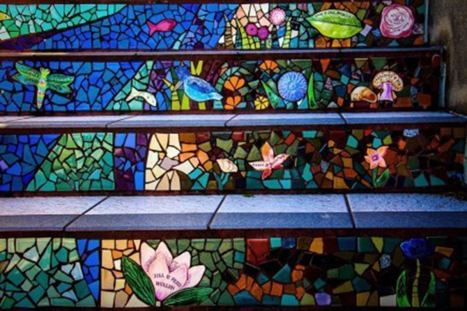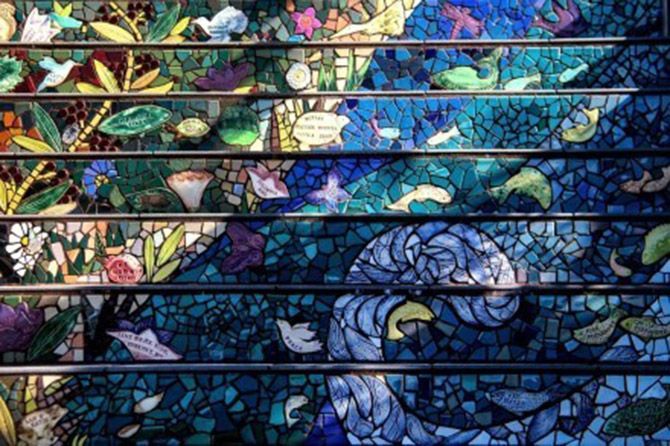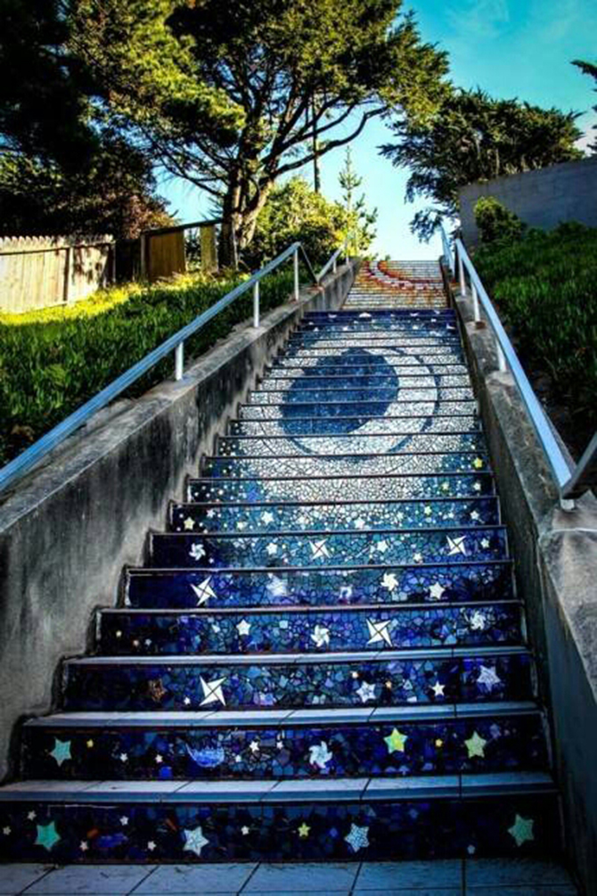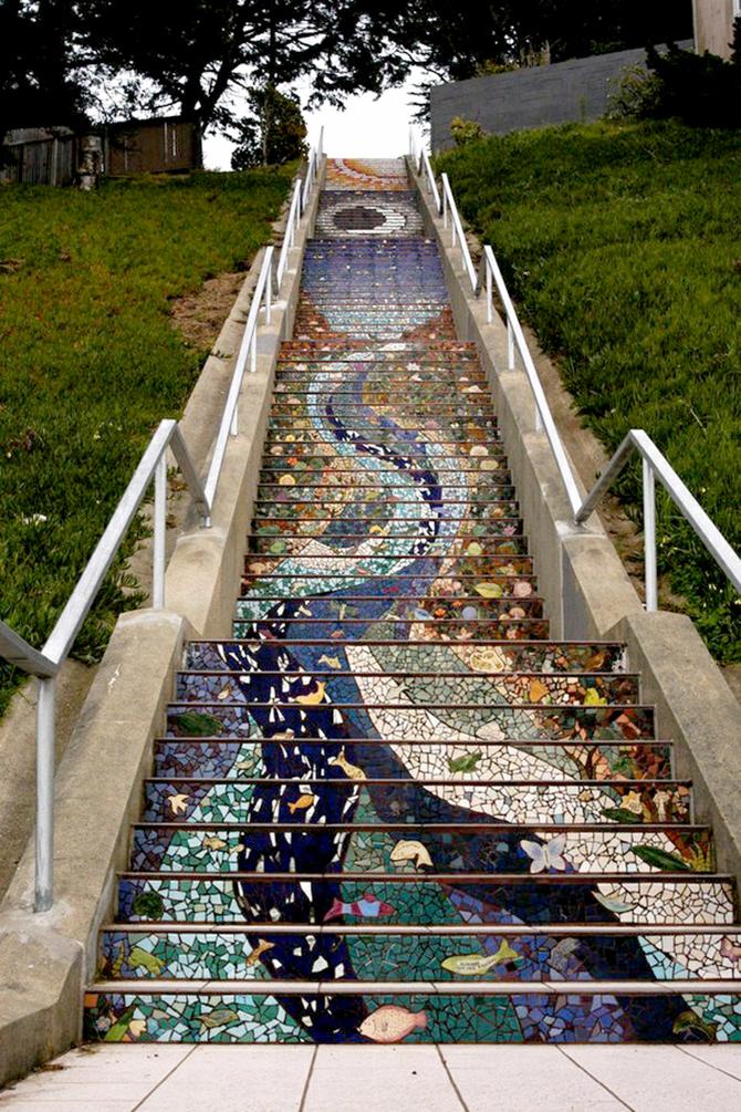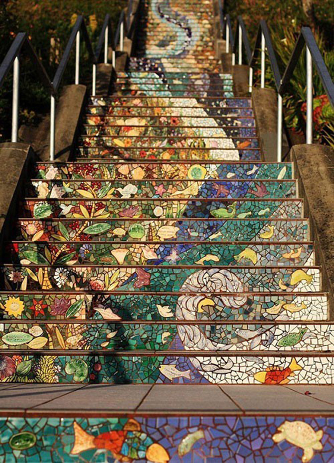 Mosaic Stairs共有163級(jí)臺(tái)階,呈35度左右的斜坡向上延伸,這件偉大的藝術(shù)作品由愛爾蘭陶藝大師Aileen Barr和舊金山馬賽克藝術(shù)家Colette Crutcher共同設(shè)計(jì),使用超過2,000塊手工制作的瓷磚與75,000塊瓷磚碎片、鏡片與彩色玻璃,帶領(lǐng)超過300名市民花費(fèi)兩年半時(shí)間完成,純手工鋪砌,制作精美,描繪了一個(gè)從海底世界到日月星辰的夢(mèng)幻場景。