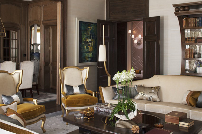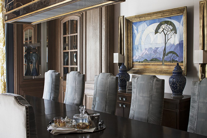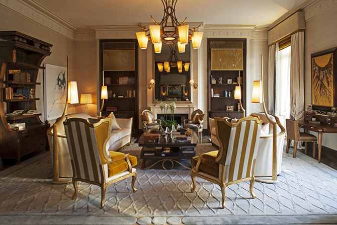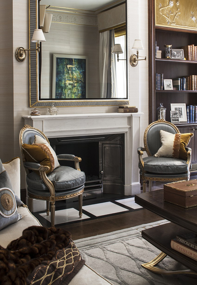 無論是家具還是地毯、枝形吊燈還是真絲墻紙上的圖案,全部都是以高規(guī)格量身定制。這是一套帶套房的臥室、客房和傭人房的大公寓,這里既體現(xiàn)了法式的傳統(tǒng)優(yōu)雅,又融入了現(xiàn)代時尚的裝修風(fēng)格,設(shè)計師將這兩點和諧共生。這間公寓引人注目的特點或許是走廊里那個受到巴黎新藝術(shù)啟發(fā)而制成的孔雀羽毛玻璃板。設(shè)計師花了一年時間來尋找他中意的材質(zhì),終發(fā)現(xiàn)只有這種材質(zhì)才能精準地表達出他想表現(xiàn)的那種意思。其他亮點也不勝枚舉,手繪真絲墻紙材質(zhì)特別,在自然光線的照射下反射出柔美的光暈。