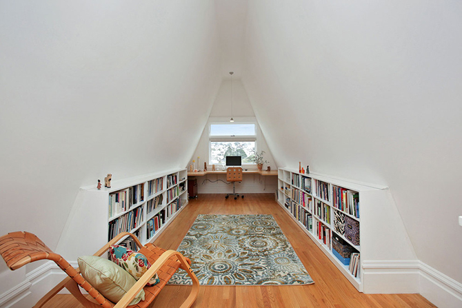 溫馨的軟裝布置下,閣樓也可以是堆滿玩具供孩子盡情玩樂的小小天地。即便空間狹小,將不規(guī)則的墻體硬件稍加利用去裝飾,就是一個開放式的書房,光源從高高的玻璃落地窗透了進來,天然的光線使人工作起來異常輕松。