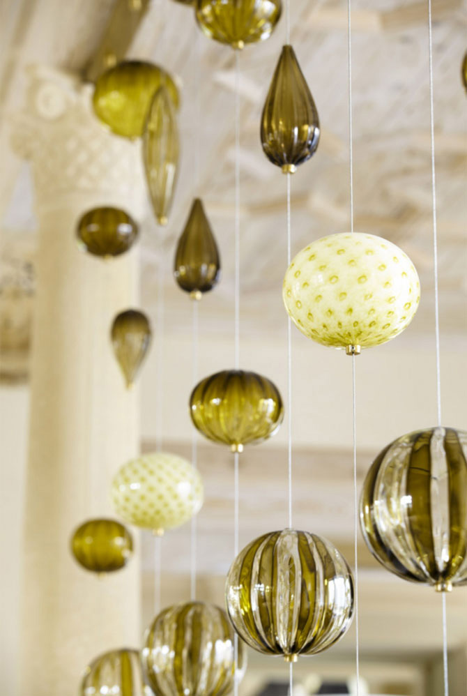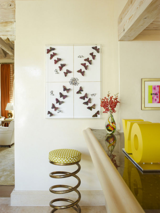 值得一提的是軟裝布置亮點(diǎn)頗多,用作隔斷的琉璃幕簾,起風(fēng)時輕輕撞擊清脆悅耳,復(fù)古梳妝鏡體現(xiàn)出精湛的鏤空雕刻工藝,吧臺邊彈簧形狀的凳子別致討喜,就連蝴蝶標(biāo)本掛畫也別具匠心。