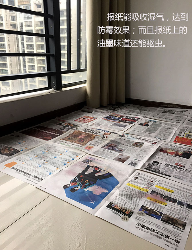 每天早上擠地鐵不是白擠的,我都會(huì)帶一份報(bào)紙回來,終于等到回南天了,我把滿屋子地上鋪滿報(bào)紙,吸附地面上的水珠妥妥的!親!衣柜底下,沙發(fā)底下也不要放過哦!親!報(bào)紙上的油墨有很好的吸水效果呢!親!報(bào)紙防潮,不產(chǎn)生任何成本,你值得擁有!