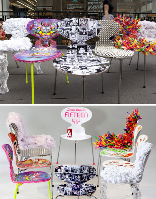 英國名廚Jamie Oliver的慈善基金Better Food基金會(huì),啟動(dòng)了一個(gè)關(guān)于椅子的項(xiàng)目,名為“The Big Chair Project”,籌集資金是為了英國創(chuàng)新型人才的培養(yǎng)。追溯至2002,Jamie創(chuàng)立了一所有別于一般的餐廳,命名叫“Fifteen”,Fifteen是Jamie Oliver專為雙失青年開設(shè)的餐廳,目的是協(xié)助失學(xué)青少年重回正軌,聘請15位輟學(xué)生來當(dāng)廚師,他從頭教導(dǎo)他們?nèi)绾闻腼?。今年這學(xué)校已是10周年,籍此 Jamie聯(lián)同了英國設(shè)計(jì)界的精英們,構(gòu)思了“The Big Chair Project”。這些都是軟裝配飾高手的杰作。