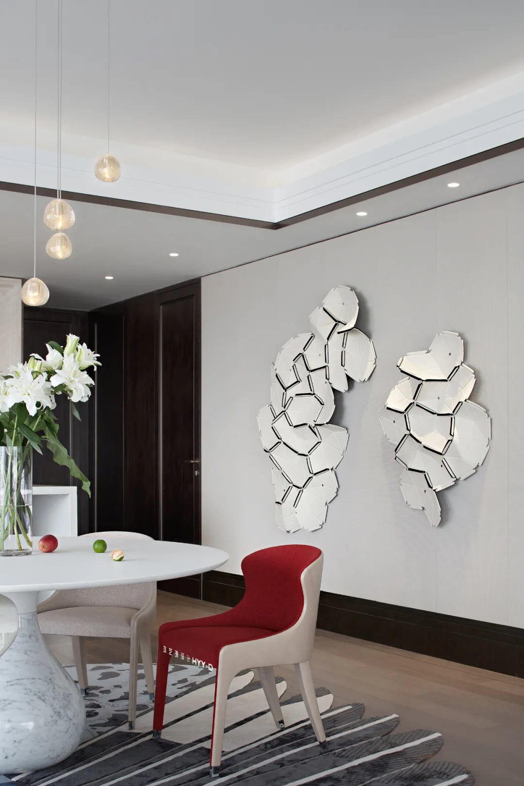 客廳空間的米灰底色低調(diào)溫暖,張弛有度,弧形沙發(fā)圍合出舒適通透的親子交流場(chǎng),言笑晏晏,清風(fēng)徐徐,撩動(dòng)紗簾,窗外的微光彌漫,遠(yuǎn)處綠樹低合,依稀還能聽到白鷺的清鳴。歷經(jīng)了萬千繁華,心之歸處原是家里那一隅清新寧靜。