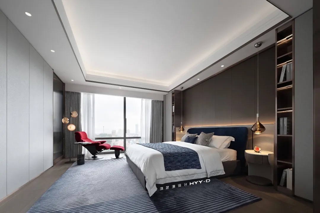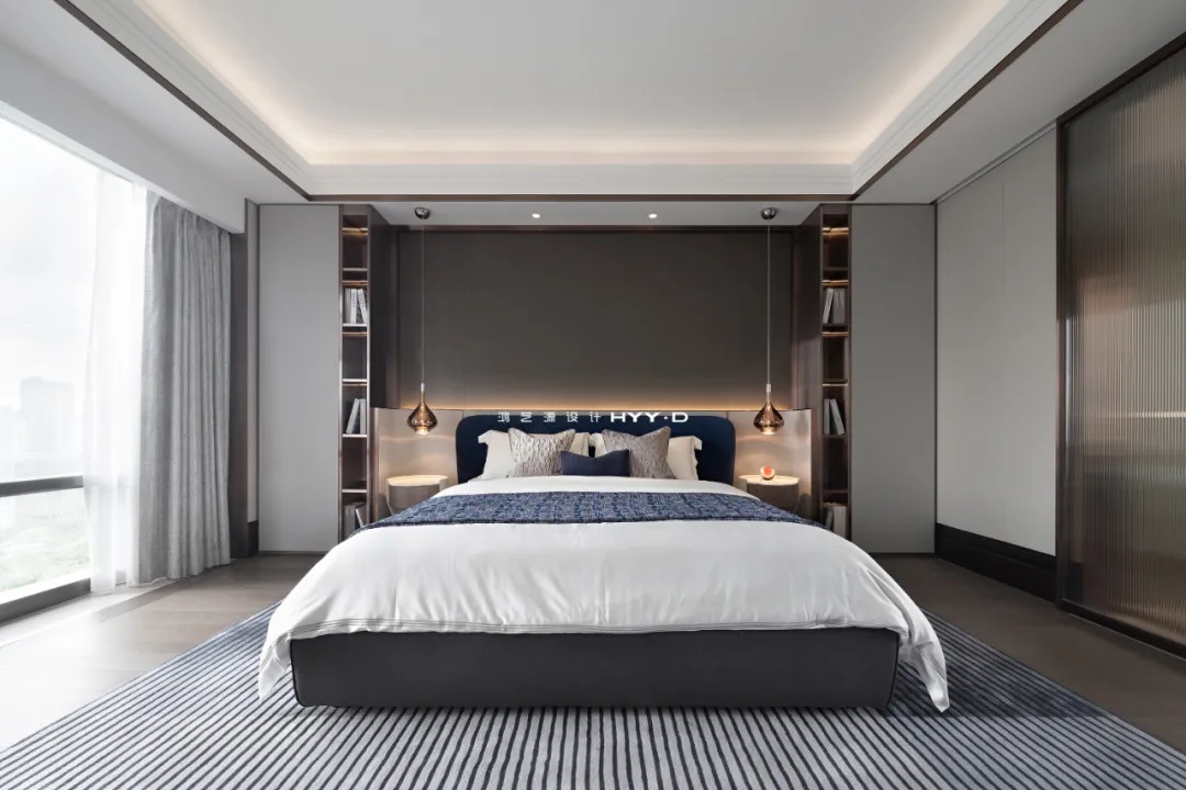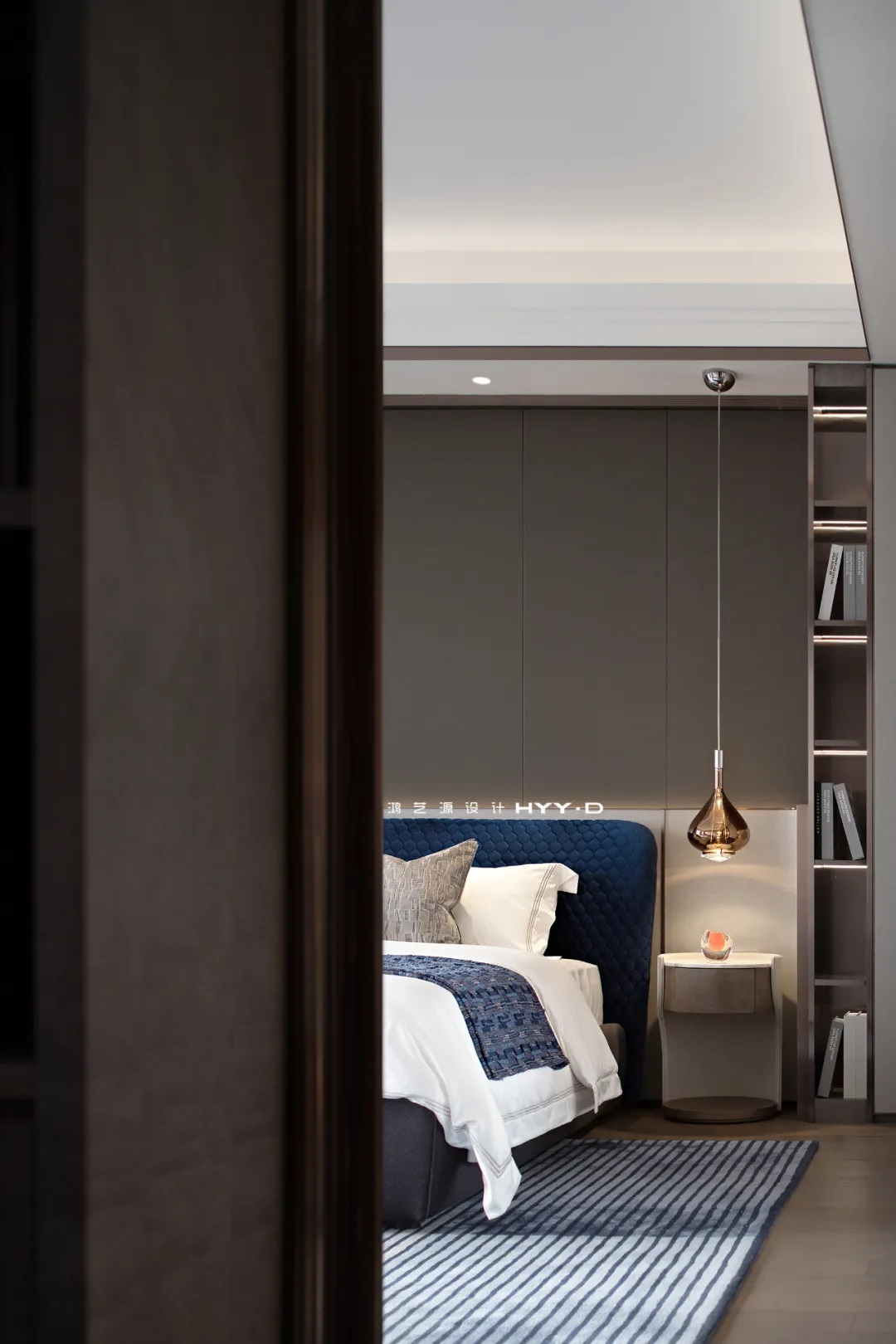 主臥在原有硬裝的基礎(chǔ)上增加了收納柜,可以隨手拿取喜歡的書籍,也可以珍藏世界各地旅行的回憶。增加了生活情調(diào)的同時(shí),也慢慢發(fā)現(xiàn)更好的彼此。金屬與棉麻的配搭,藍(lán)色與橙色的碰撞,抬眼望向窗外的那一刻,室內(nèi)的奢雅與自然的靜美達(dá)到了平衡舒適的境地。