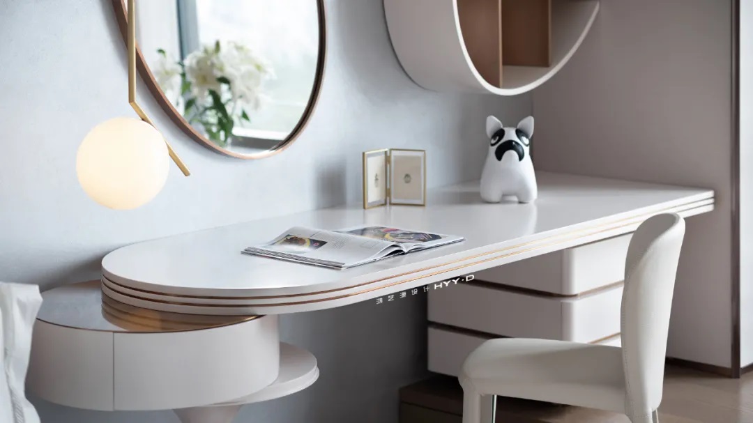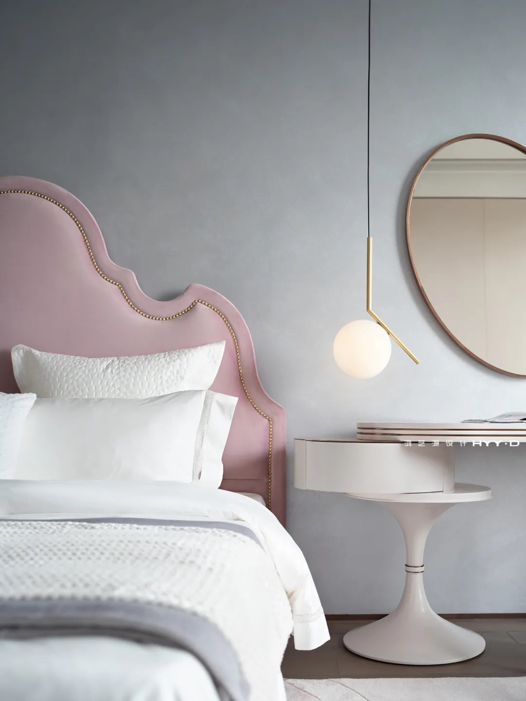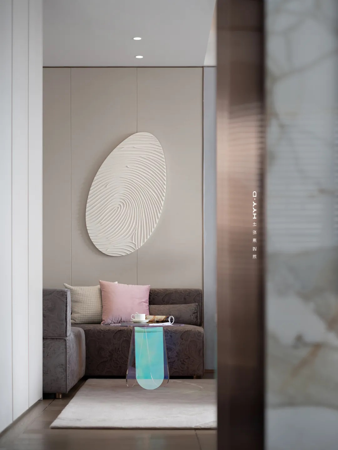 空間的自由是設(shè)計(jì)師需要考慮的重要課題,是居者想象力與審美品調(diào)的自由,粉得柔美,白得純凈,是00后小仙女夢(mèng)想中的小世界。當(dāng)被問及最喜歡哪個(gè)空間時(shí),她笑容洋溢地給出了答案:臥室。那幅定制的指紋畫便是她最個(gè)性的展現(xiàn),與一旁的橢圓妝鏡遙相呼應(yīng),不同的材質(zhì)混搭,最終通往內(nèi)心對(duì)美好生活的熱愛。